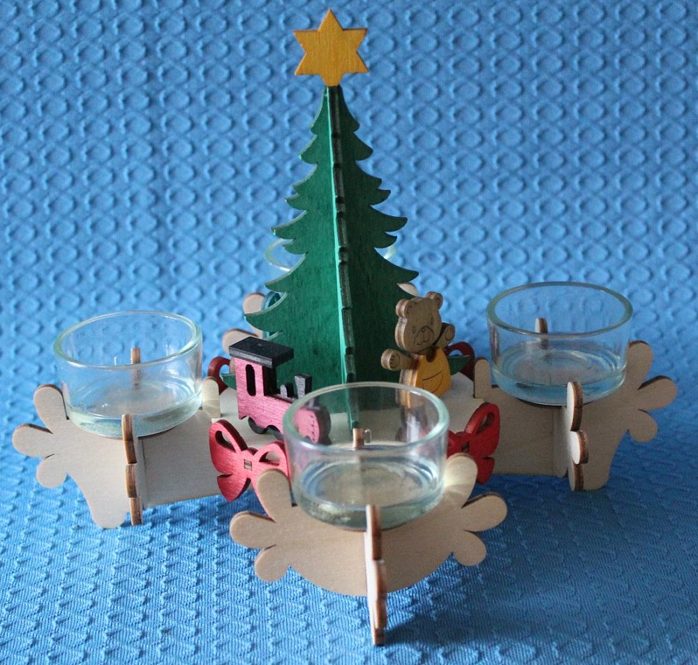 Der Adventsleuchter verkörpert die 4 Sonntage im Advent. Dieser Adventsleuchter, geeignet für 4 Teelichter, hat eine Größe von 16 x 10 x 10 cm. Passende Stumpenkerzen können auch in diesem Adventsleuchter verwendet werden. In der Mitte steht ein Weihnachtsbaum, unter dem Geschenke zu finden sind. Geschmückt ist der Adventsleuchter mit Schleifen und der Weihnachtsbaum mit einem Stern. Er ist 1 Stück vorrätig.