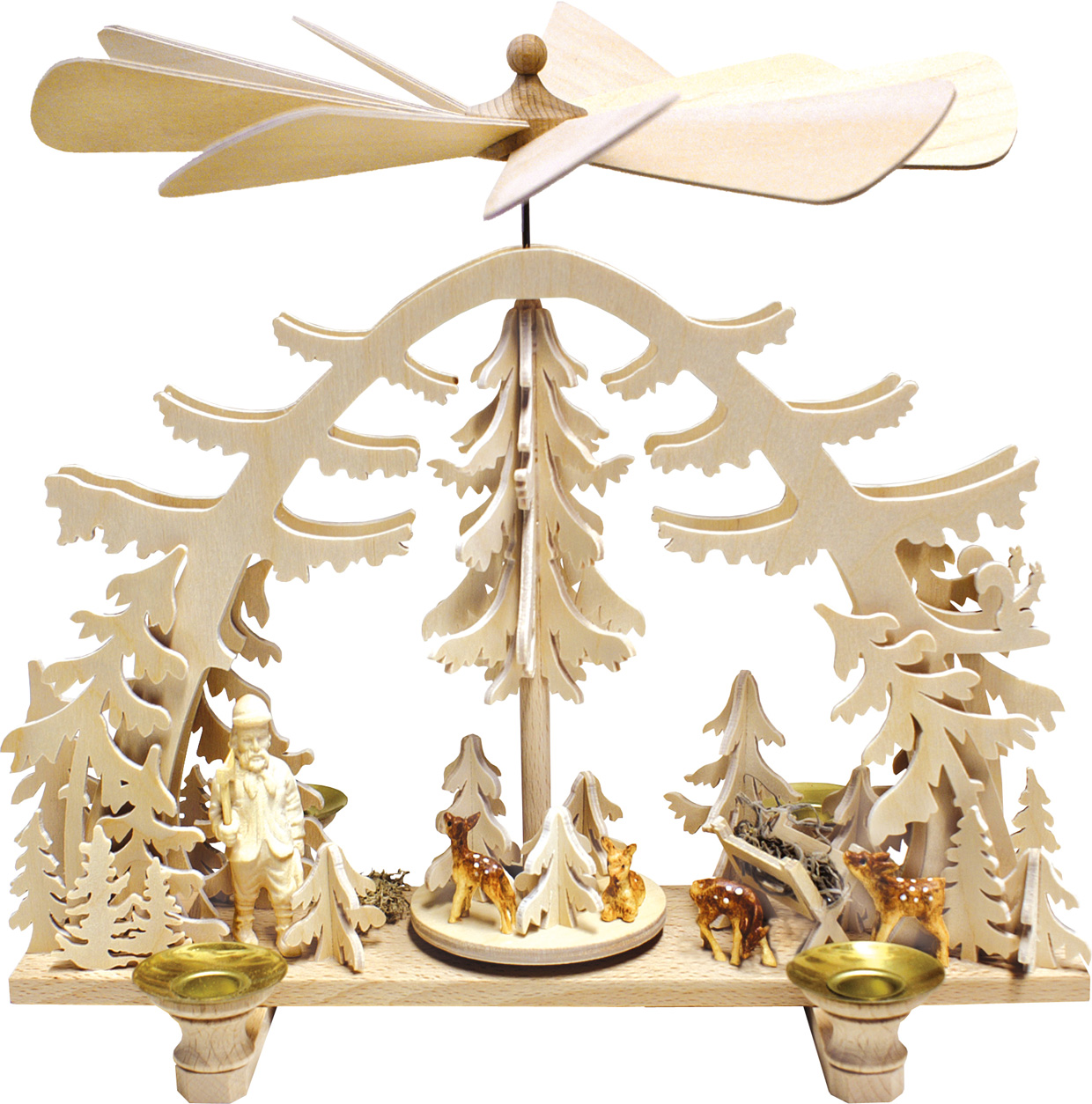Ein Förster macht seinen Inspektionsgang durch den Wald. Es gilt die Wege frei zuhalten und das Wild zu versorgen. Die Krippe ist gefüllt, so dass er sich wieder auf den Heimweg machen kann. Eine Drehscheibe mit Rehen und Bäumen bildet den Mittelpunkt der Pyramide und wird durch vier angezündete Pyramidenkerzen angetrieben.