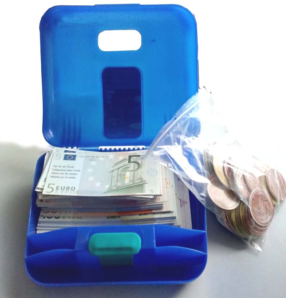 Der Rechengeldsatz besteht auch 46 Euro Banknoten und 87 Münzen, sowie 12 Grundrechenzeichen.