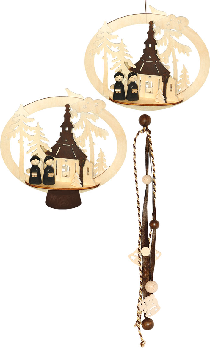 Schöne Fensterdekoration Seiffner Kirche mit Kurrende in natur zum Aufhängen mit braunem Band.