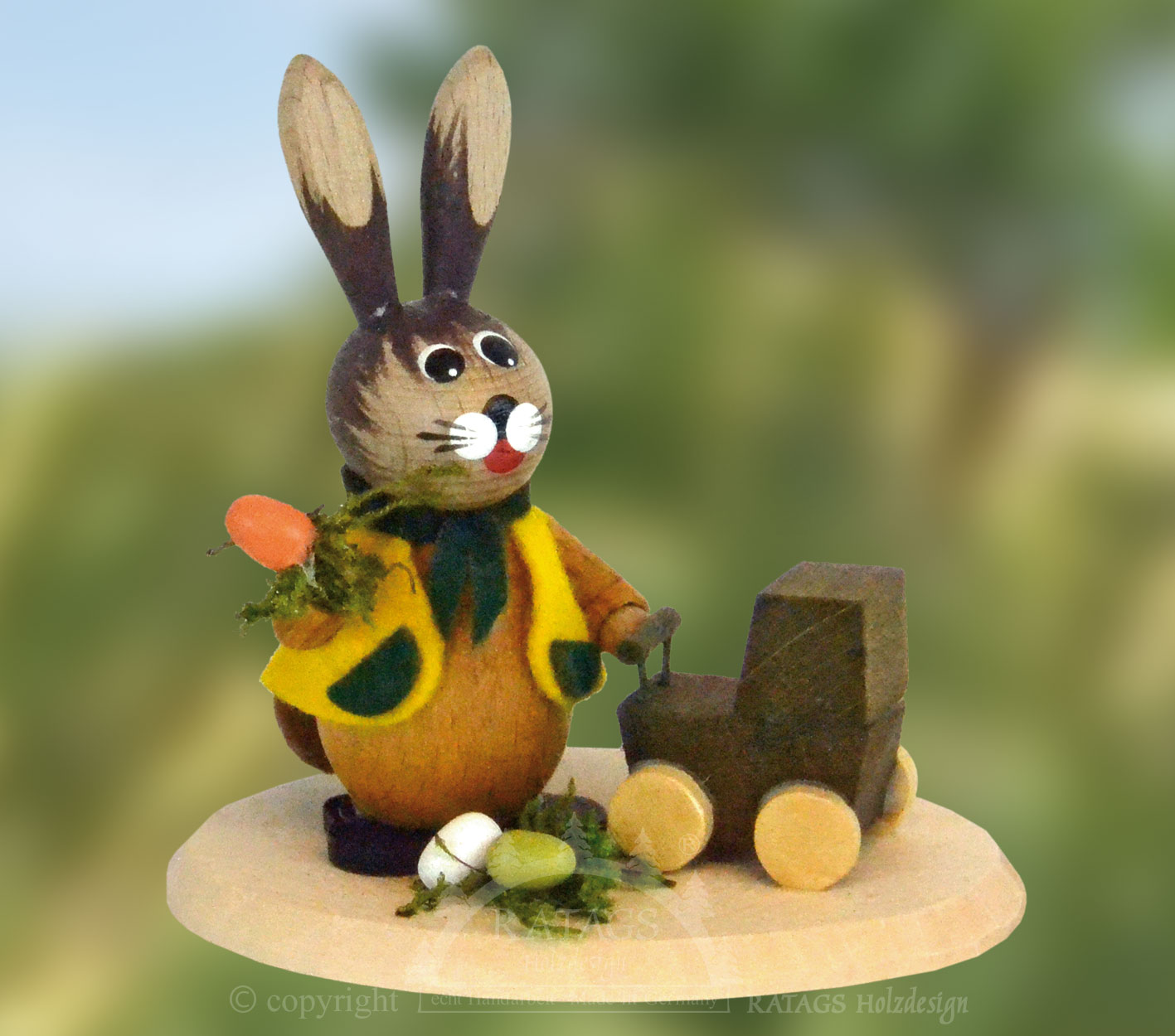 Hasenwiese auf Massivholzplatte mit Häschen und Puppenwagen, Ostereiern und floraler Deko.