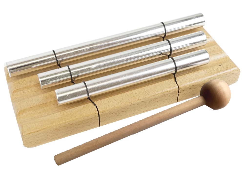 Klangstab auf Holzplatte mit 3 Klangstäben und einem Holzschlägel.