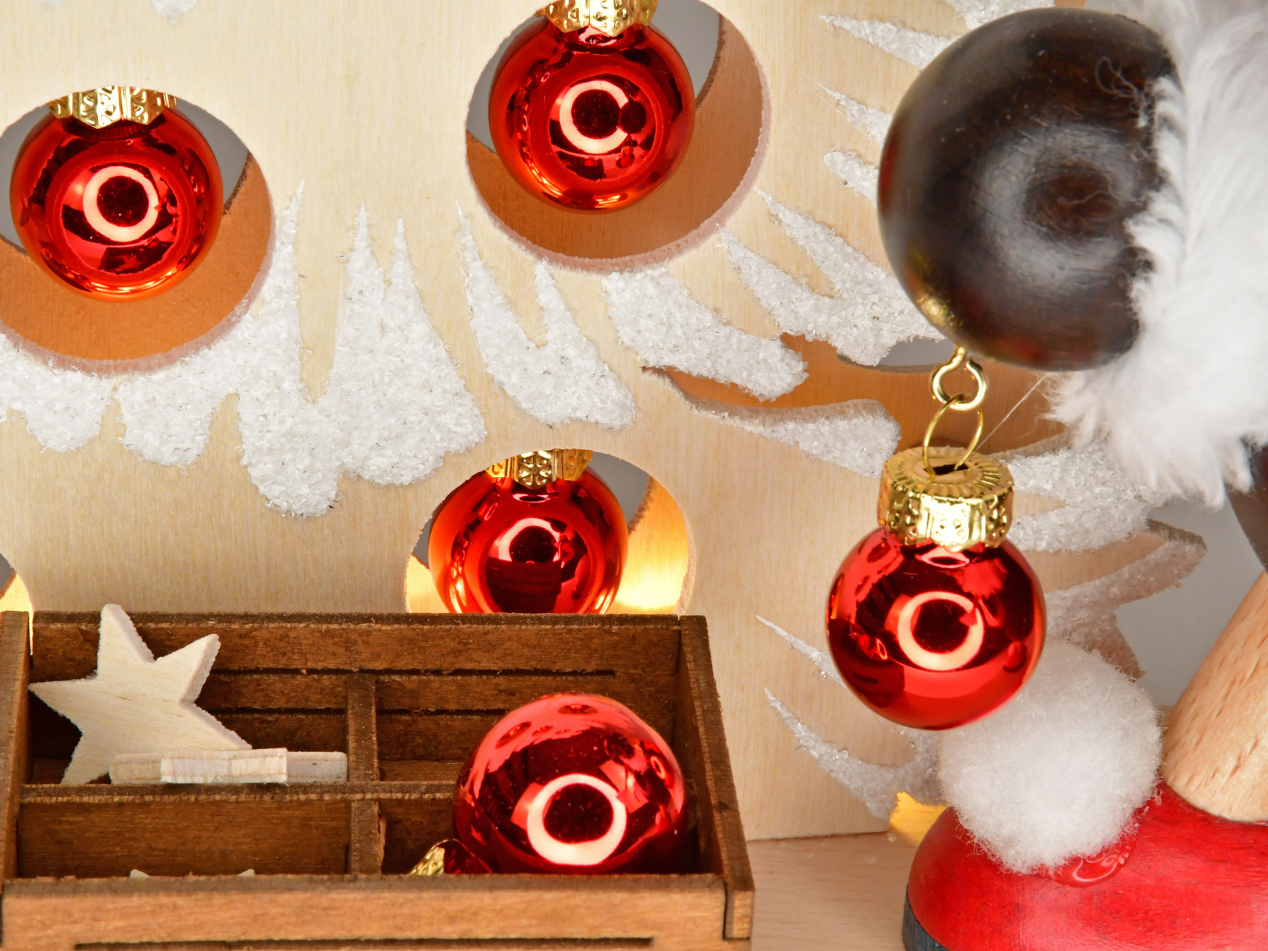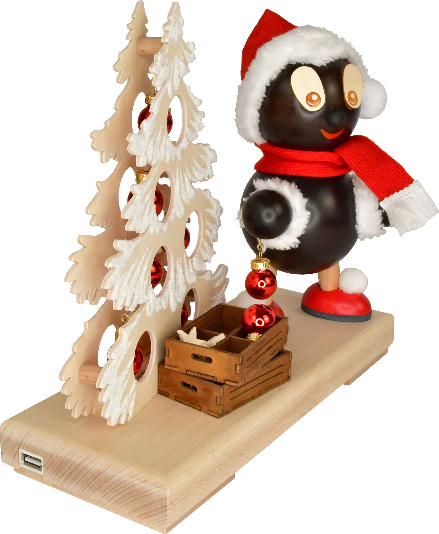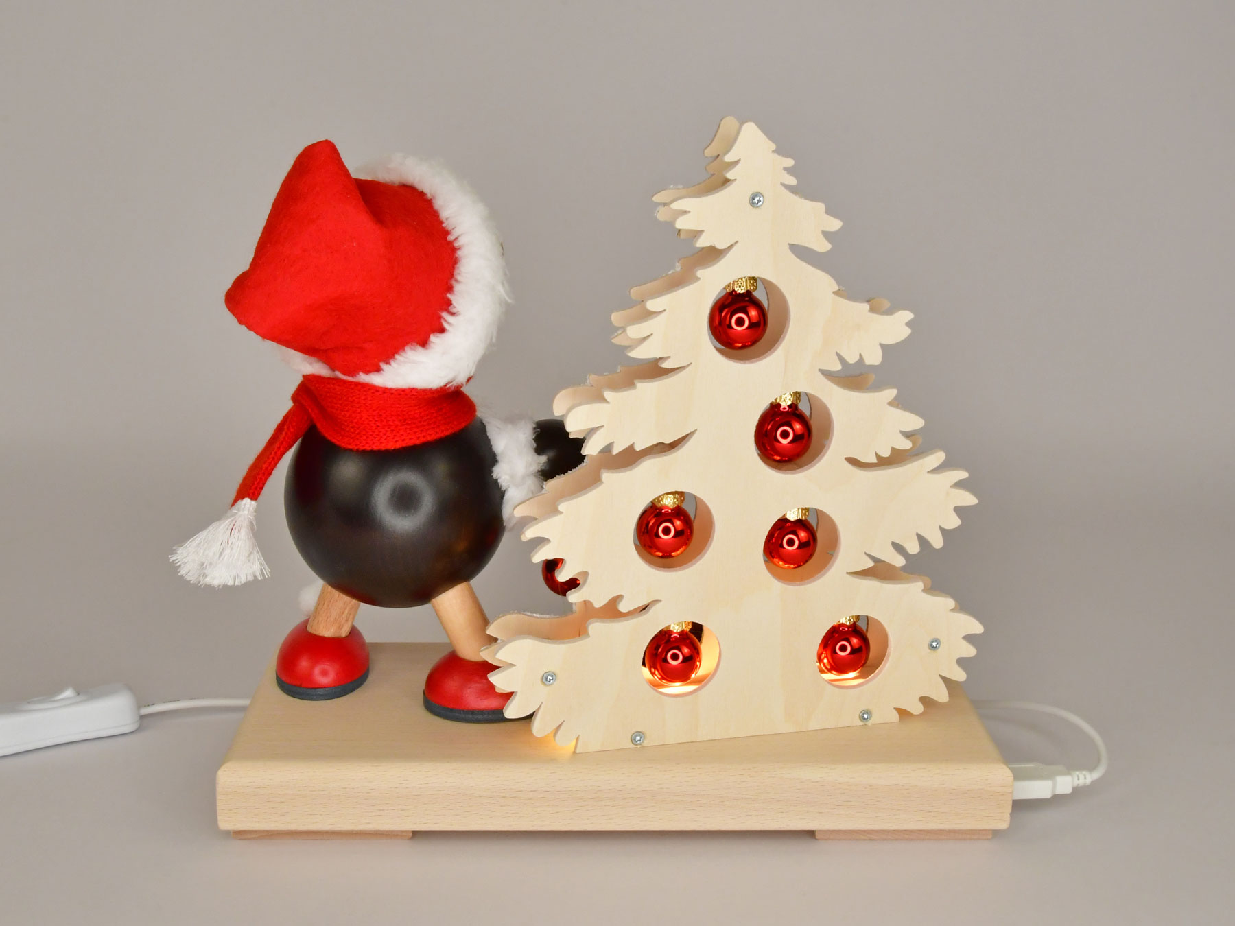 Wir präsentieren die beliebte Kultfigur Pitti beim Schmücken seines Weihnachtsbaumes. Die roten Echtglas-Kugeln müssen behutsam in den Tannenbaum gehängt werden. Die Tanne besteht aus hellem Birkensperrholz und ist mit glitzerndem Raureif veredelt. Sie ist indirekt beleuchtet und erzeugt eine stimmungsvolle Atmosphäre. Pitti ist komplett aus Hartholz gefertigt, ebenso die Grundplatte. Dieses Hartholz verhält sich besonders formstabil. Die Lasur haben wir so poliert, dass sie einen edlen seidenmatten Glanz entwickelt. Der charakteristische weiße Pelz auf Kopf und Armen kontrastiert zum dunklen Körper. Die beiden roten Schuhe tragen jeweils eine weiße Bommel. Die Stromversorgung über einen USB-A-Stecker ermöglicht eine dezentrale netzunabhängige Aufstellung, z.B. durch eine Powerbank.