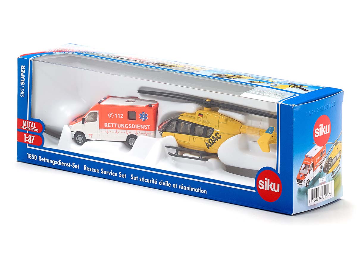 Set bestehend aus einem Mercedes-Sprinter Rettungswagen und einem Rettungshubschrauber der Marke Eurocopter EC 145.