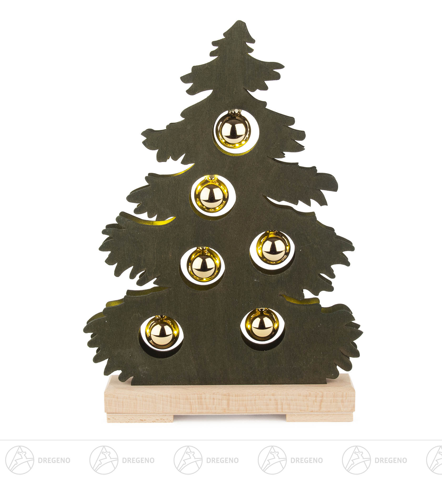 Das Fachgeschäft Volkskunst aus Seiffen präsentiert den Artikel Tanne klein,grün gebeizt,goldene Kugeln mit 10er LED-Lichterkette (USB) 33x23cm der Marke Dregeno