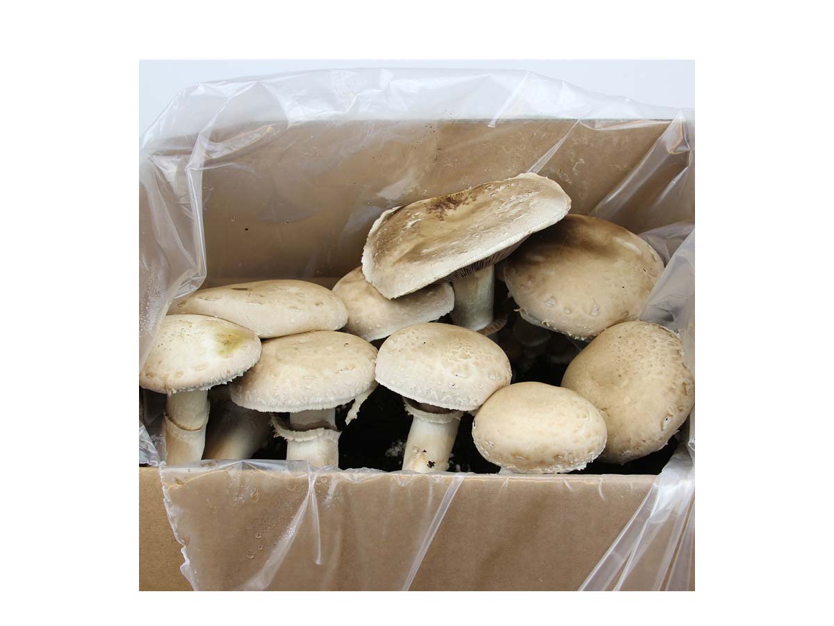 Sie bereiten die Box vor. Nach ca. 10 Tagen hat sich das Mycel ausgebreitet. Dann geht es schnell: Die Pilze sprießen und nach weiteren 10 Tage können sie geerntet werden. Bei den ersten beiden Ernten ernten Sie i. d. R. ca. 900 g Champignons (7-10 Pilze).