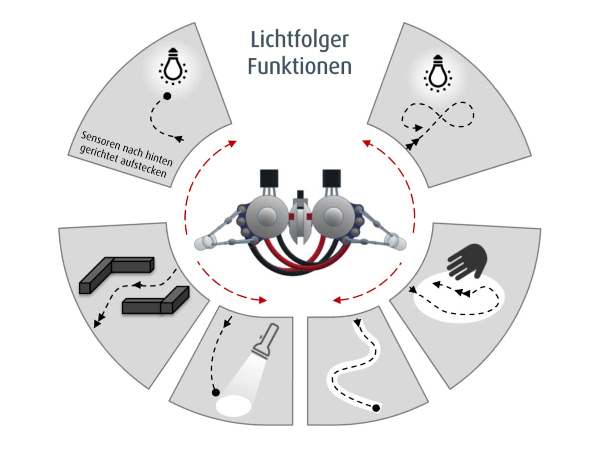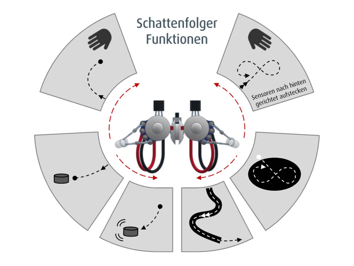 - Stoppt oder beschleunigt bei Hindernissen, Licht oder Schatten
