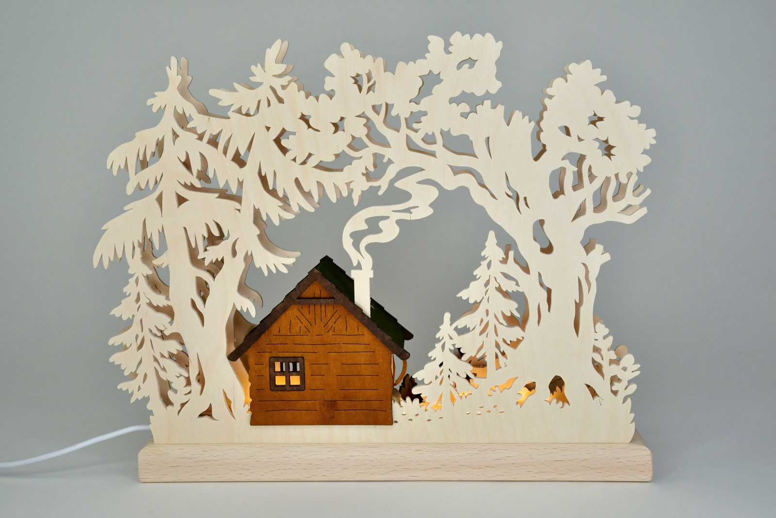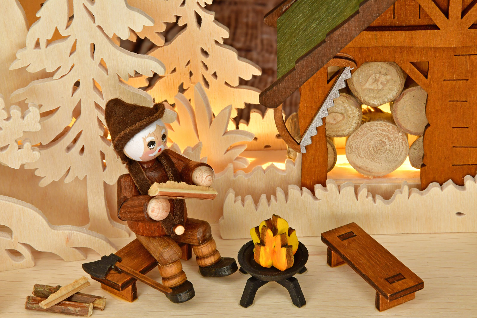 Dieser RATAGS-Schwibbogen zeigt ein idyllisch gelegenes Waldhaus auf einer Lichtung. Der Bewohner sitzt mit einem Scheit vor einer Feuerschale und genießt den Abend. Das offen stehende Waldhaus gibt den Blick frei auf reichliche Holzvorräte. Der Winter kann kommen. Beleuchtet wird die friedliche Szene von einem blendfrei montierten LED-Stripe.