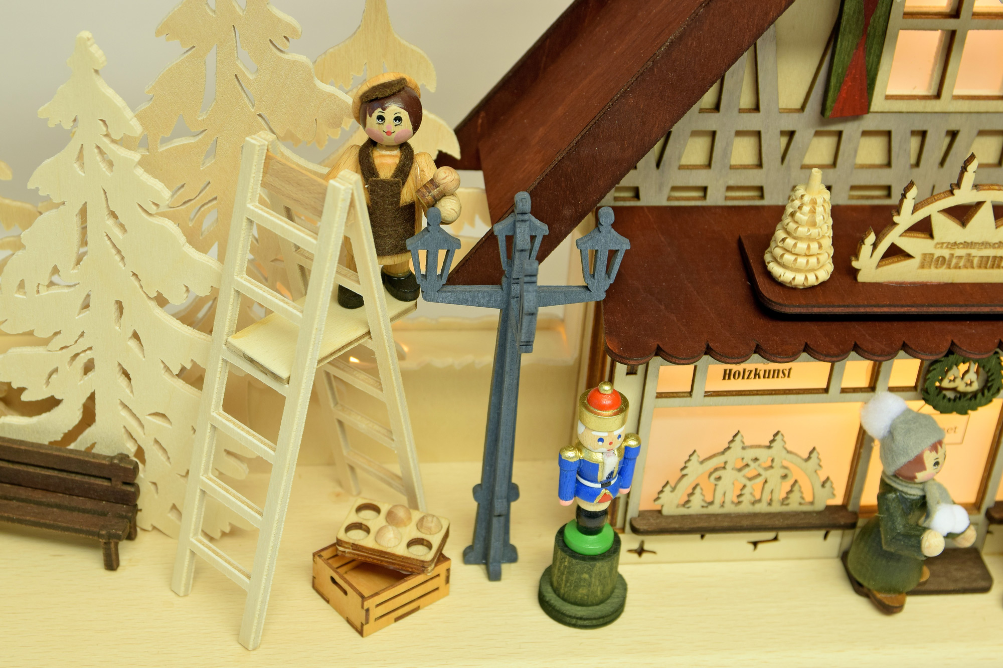 Dieser opulent ausgestattete Schwibbogen zeigt rege Betriebsamkeit in der Vorweihnachtszeit. Ein erzgebirgisches Fachgeschäft lädt zum Bummeln ein, die matten erleuchteten Schaufenster verheißen ein verführerisches Angebot. Ein Handwerker steht auf der Leiter und schmückt den Straßenzug, während ein Pärchen schon das erste Weihnachtsgeschenk gekauft hat. Ein munteres Hündchen springt die Treppe hoch. Alle Figuren sind aus Massivholz gearbeitet. Die indirekt verbaute, blendfreie LED-Beleuchtung schafft eine behagliche Atmosphäre. Ein dekoratives Stück Handarbeit für Erzgebirgsliebhaber aus dem Hause RATAGS.