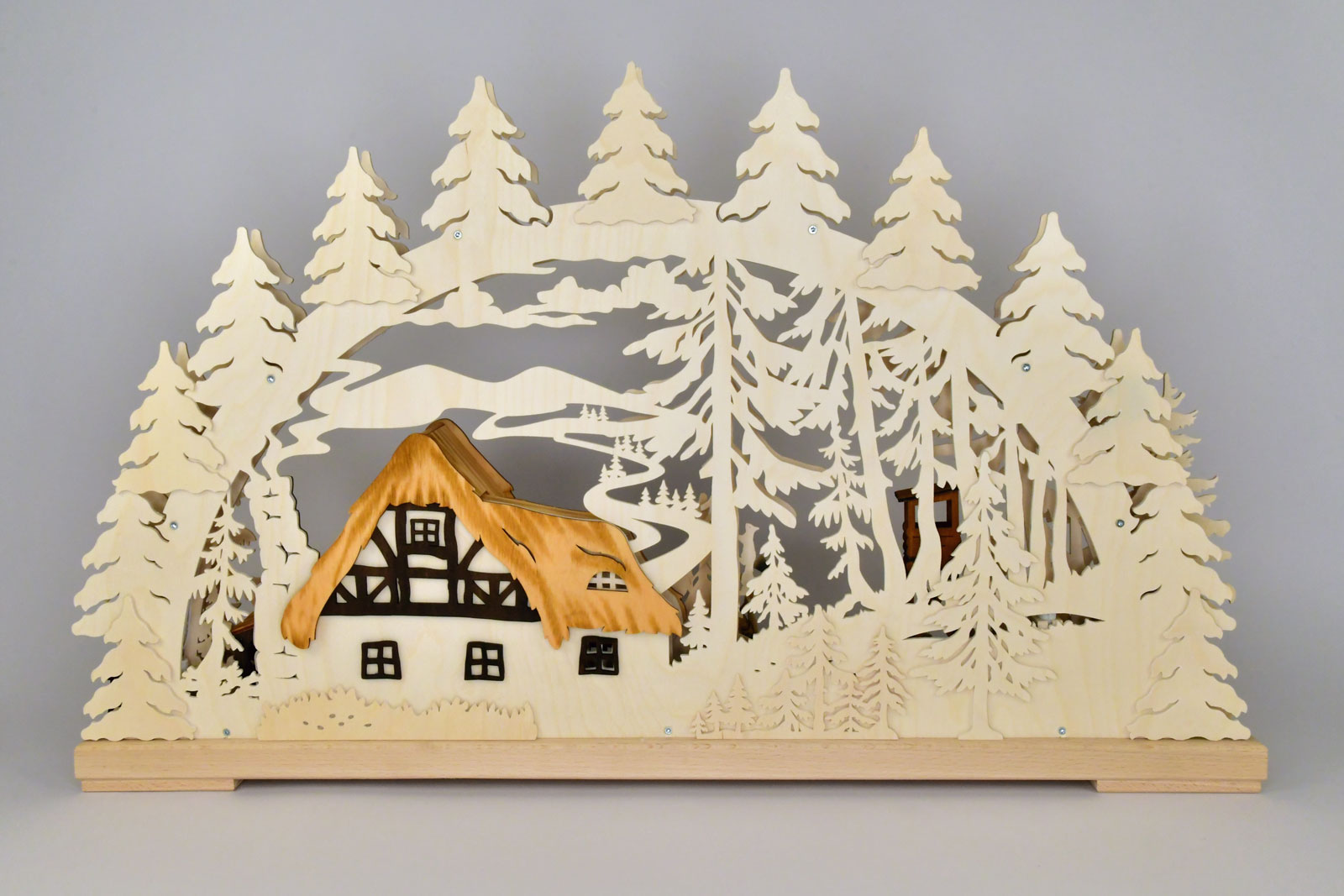 Inmitten einer idyllischen Waldszene steht ein reetgedecktes Fachwerkhaus. Rauch steigt aus dem Schornstein auf und vermittelt Behaglichkeit. Fenster und Tür sind erleuchtet, Dach und Fachwerk farbig abgesetzt. Der Holzfäller ist bei der Vorbereitung auf den Winter, er hackt und bevorratet sich mit Brennholz. Sein munteres Hündchen kommt herbeigesprungen um ihn an den baldigen Feierabend zu erinnern. Unweit des Hauses steht ein Jägeranstand. Die Figuren sind aus Massivholz gefertigt und coloriert. Dieser RATAGS-Schwibbogen ist indirekt beleuchtet und erzeugt eine stimmungsvolle Raumatmosphäre.