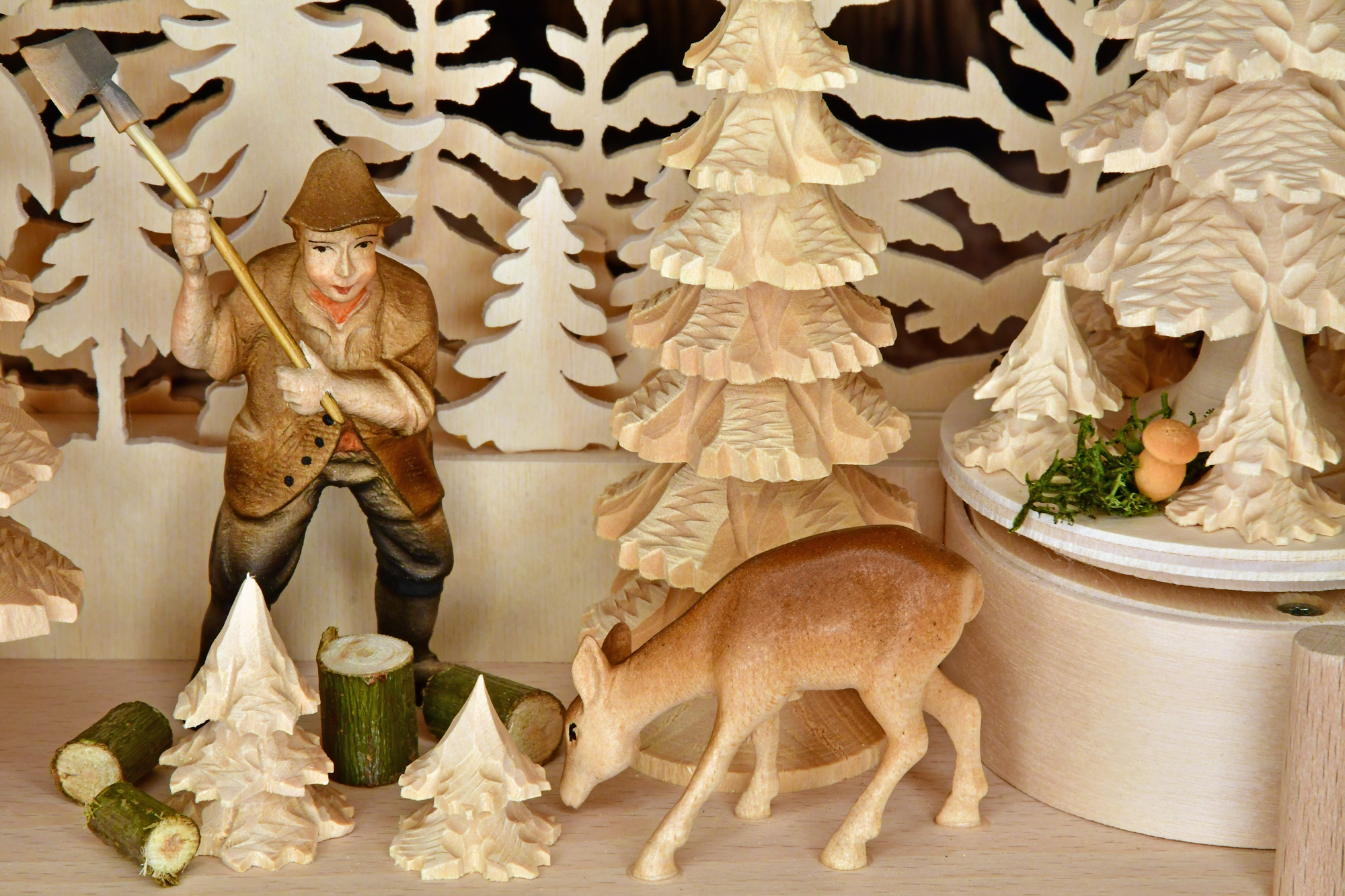 Blickfang dieses opulenten RATAGS Schwibbogens ist das alte Zollhaus. Es ist in Fachwerk ausgeführt und steht eingebettet in einen dichten Wald. In der Ferne sind ein weiteres Fachwerkhaus und Sandsteinfelsen erkennbar. Vor dem Alten Zollhaus patroulliert ein Wachmann mit Hellebarde, begleitet von seinen beiden Hunden. Auf einer nahegelegenen Lichtung schlägt ein Waldarbeiter Holz und wird dabei beobachtet von zwei friedlich äsenden Rehen. Alle Figuren sind in Massivholz ausgeführt, geschnitzt und farbig lasiert. Hochwertige Massivholzbäume zieren den Vordergrund. Ein weiteres Highlight dieses erzgebirgischen Schwibbogens ist die sich drehende elektrische Pyramide. Für eine zauberhafte Beleuchtung der idyllischen Szenerie sorgt eine blendfrei montierte LED-Lichterkette.