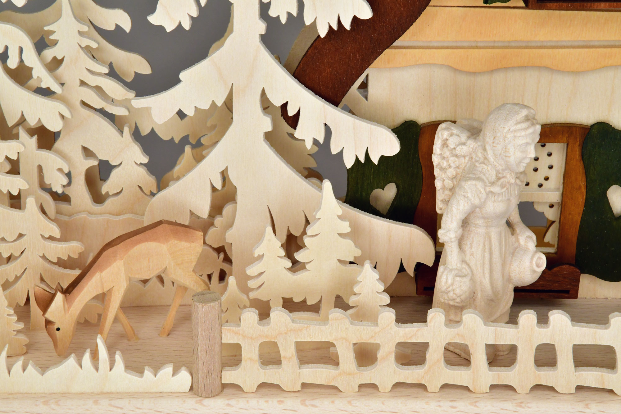 Romantisch steht das Forsthaus mit seinen bunt bemalten Fensterläden im Wald. In der Nähe fressen Rehe aus einer Futtergrippe. Vor dem Haus sitzt der Förster, hängt seinen Gedanken nach. Er erwartet seine Frau, die schwerbepackt vom Markt heimkehrt. Die indirekte, blendfrei verbaute Beleuchtung sorgt für eine stimmungsvolle Raumatmosphäre.
