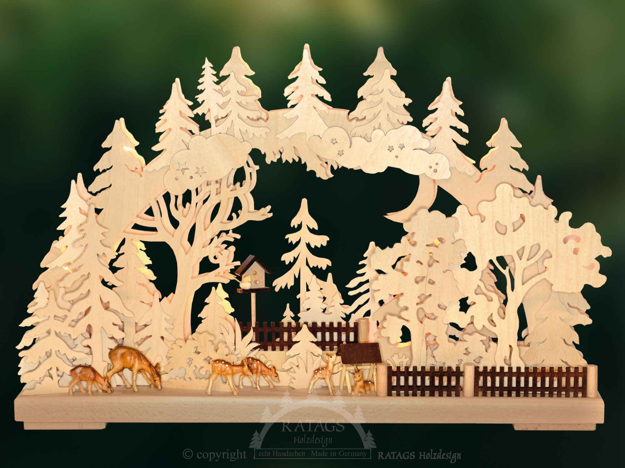 Auf Futtersuche sind in diesem erzgebirgischen 3D-Schwibbogen 6 Rehe, davon 4 Rehkitze, ein Anblick, der die Herzen von Naturliebhabern höher schlagen lässt. Die Figuren sind liebevoll von Künstlerhand geschnitzt und bemalt. Inmitten des Waldes aus gesägtem Birkensperrholz zwitschert ein Vogel in einem Vogelhaus lustig sein Lied. Hoch oben im Geäst hämmert ein Specht. Durch eine LED-Lichterkette erstrahlt die idyllische Waldszenerie in einem romantischen Licht.
