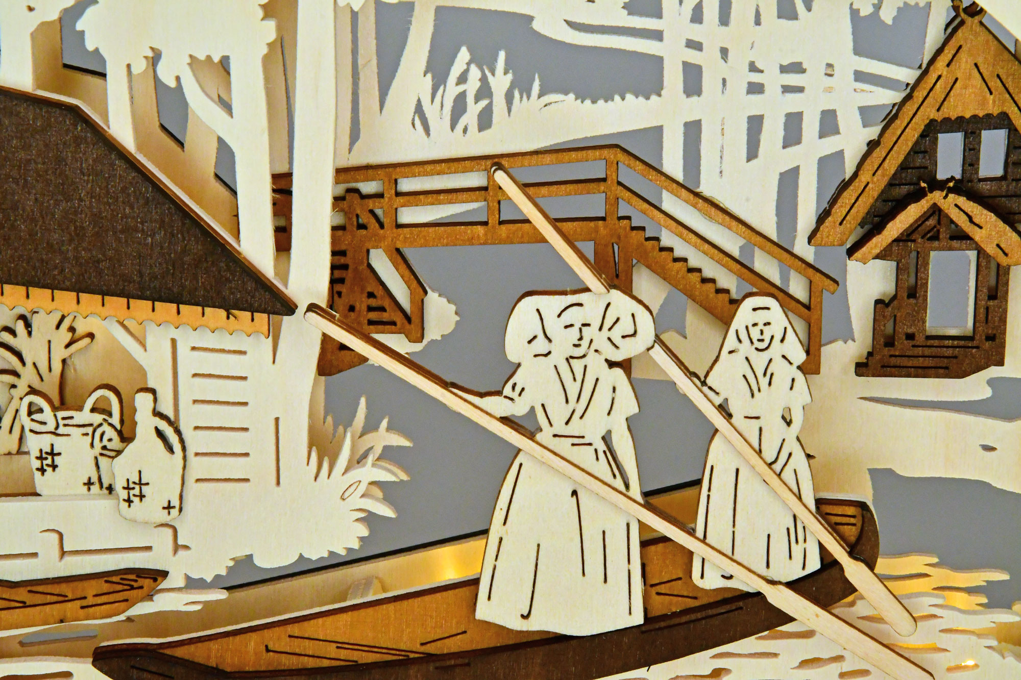 Zwei Spreewald-Häuschen stehen in der Wasserlandschaft der Spree, gesäumt von fruchtbaren Wiesen. Zwei Frauen in charakteristischer Spreewaldtracht staken ihren Kahn vorüber an einem Korbmacher, der frische Weidenzweige zu Geflecht verarbeitet. In der Ferne kann man eine typische Spreewaldbrücke ausmachen, die hoch über dem Fluß die Durchfahrt der Bote ermöglicht. Stimmungsvoll beleuchtet wird die Szenerie durch eine blendfrei verbaute LED-Beleuchtung. Ein Schwibbogen für das ganze Jahr.