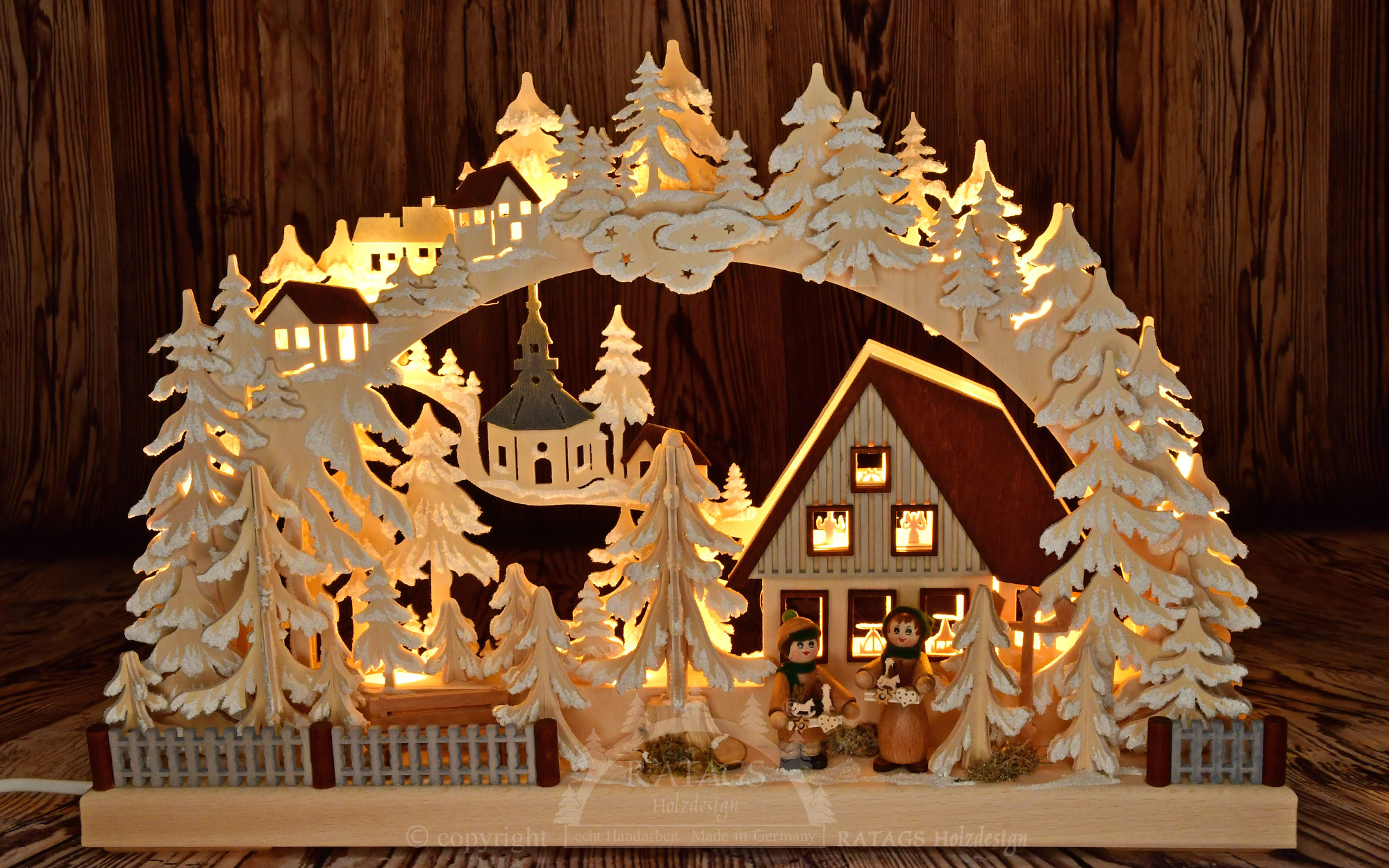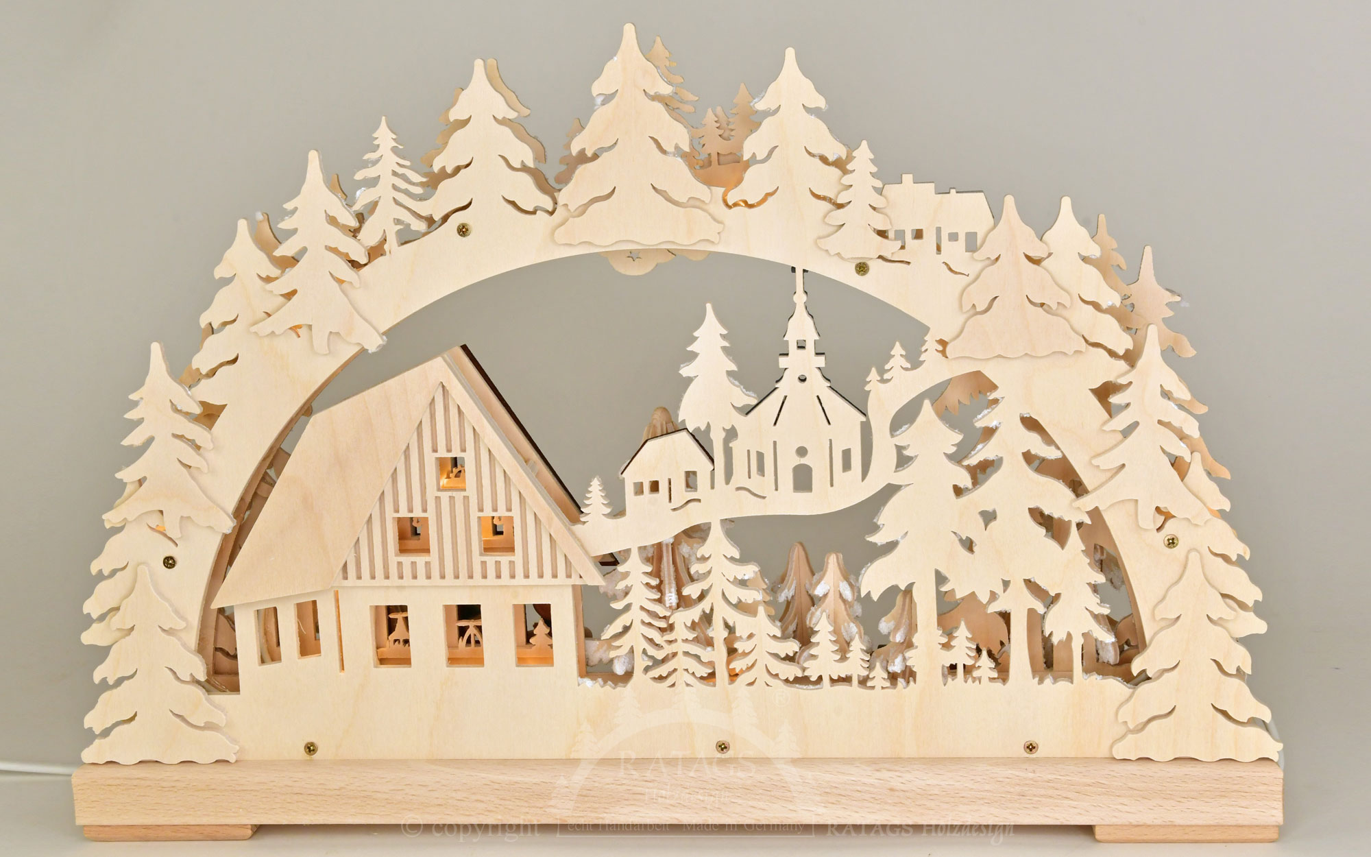 Unser 3D-Schwibbogen wurde in liebevoller Handarbeit mit frostigem Raureif verziert.