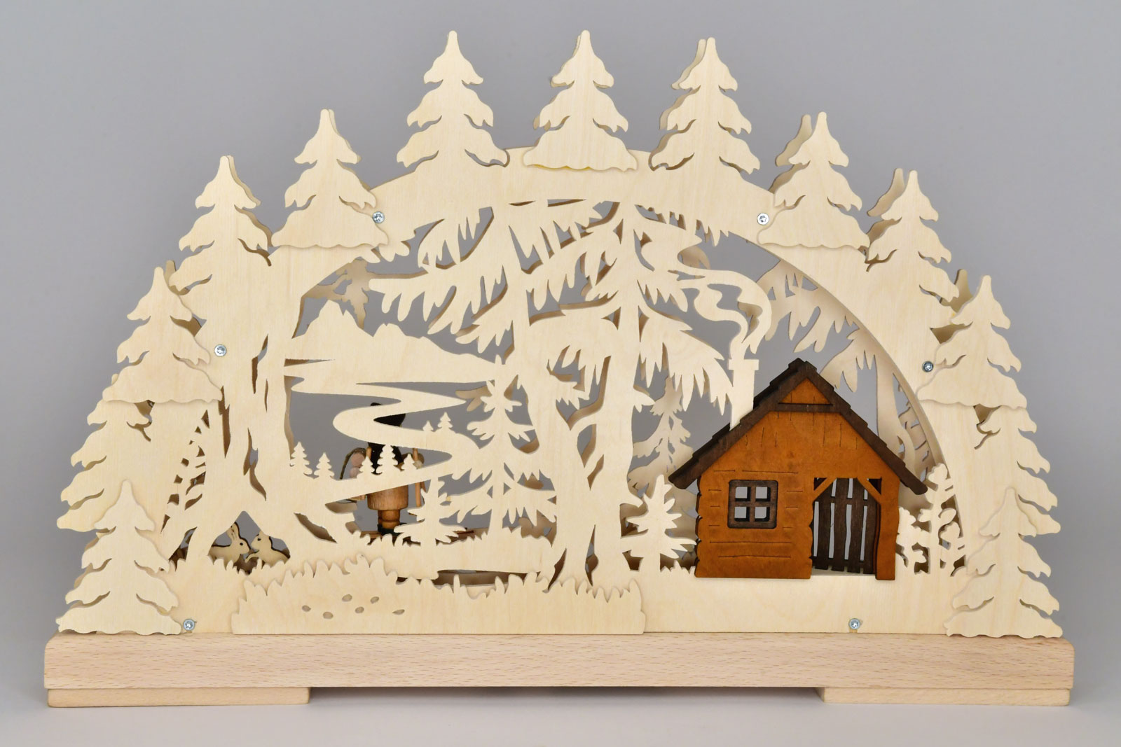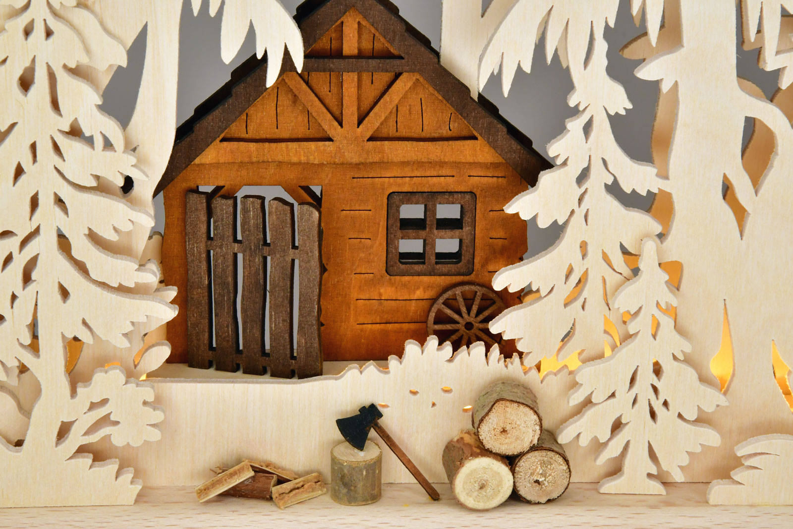 Inmitten eines dichten Waldes steht die Hütte eines Holzfällers. Rauch steigt aus dem Schornstein auf und vermittelt Behaglichkeit. Axt, Hackklotz und Brennholz vor dem Haus geben Zeugnis von der begonnenen Tätigkeit. Da naht auch schon der Hausherr auf seinen Skiern. Er hat frisches Brennholz auf seinem Lastengestell. Dieser RATAGS-Schwibbogen aus Birkensperrholz ist indirekt beleuchtet und erzeugt eine stimmungsvolle Raumatmosphäre. Die Figur ist aus Massivholz gefertigt und farbig gebeizt.
