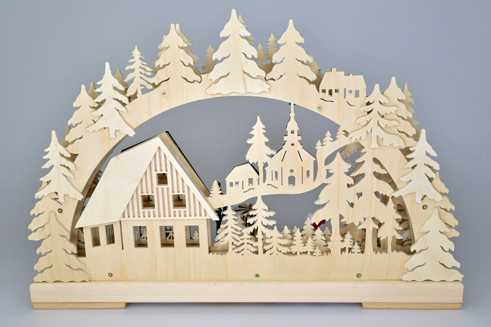 Unser 3D-Schwibbogen wurde in liebevoller Handarbeit mit frostigem Raureif verziert.