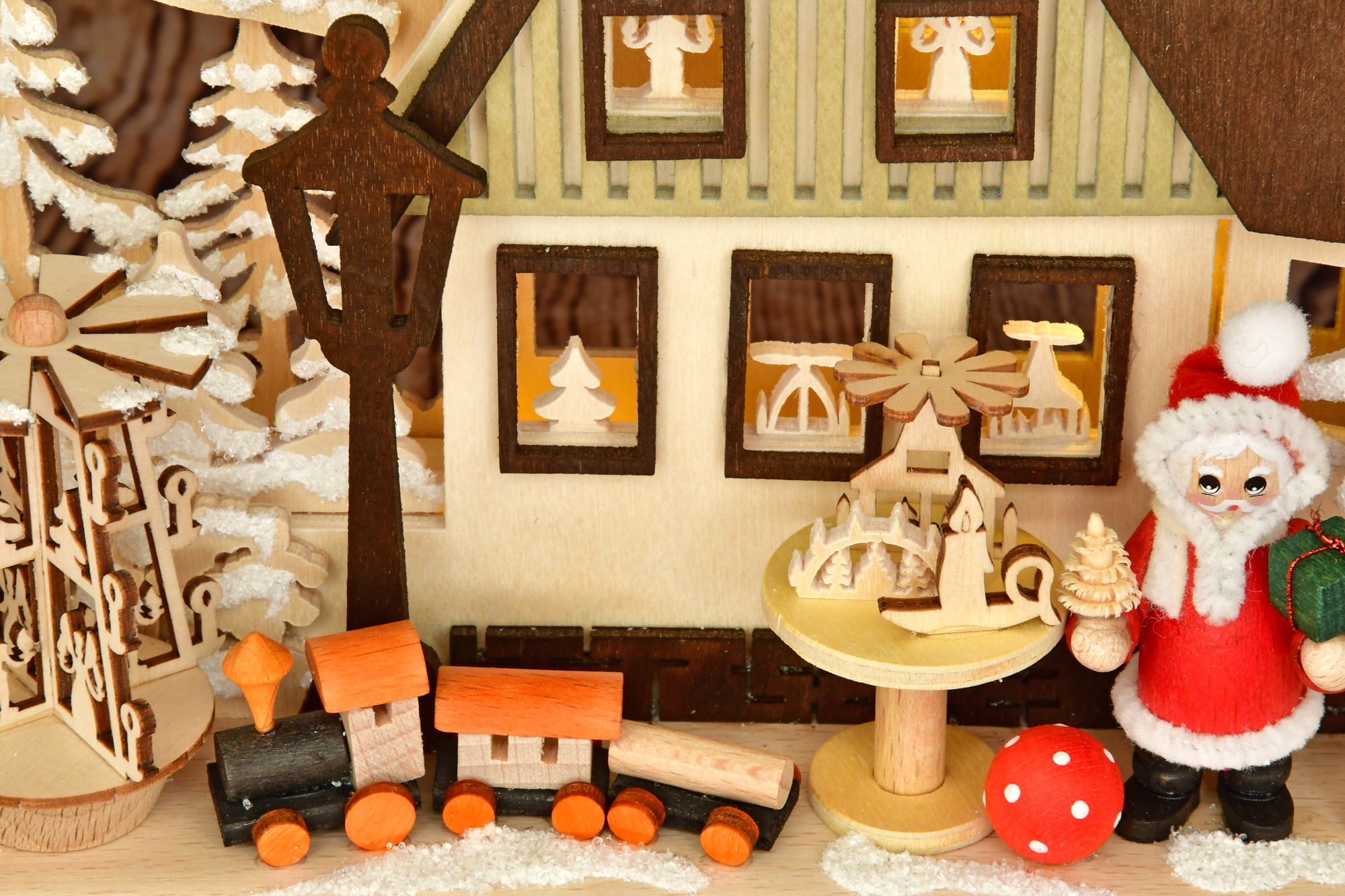 Inmitten einer schönen Erzgebirgslandschaft bereiten 2 Weihnachtsmänner vor ihrer Werkstatt die Geschenke für das Weihnachtsfest vor: Holzeisenbahn, Pyramiden und Schwibbögen, Fußball und weiteres Spielzeug. Alle Fenster des kolorierten Erzgebirgshauses sind liebevoll geschmückt und dekoriert. Der von Hand gefertigte und bemalte 3D-Schwibbogen wird indirekt mit einer LED-Lichterkette beleuchtet.