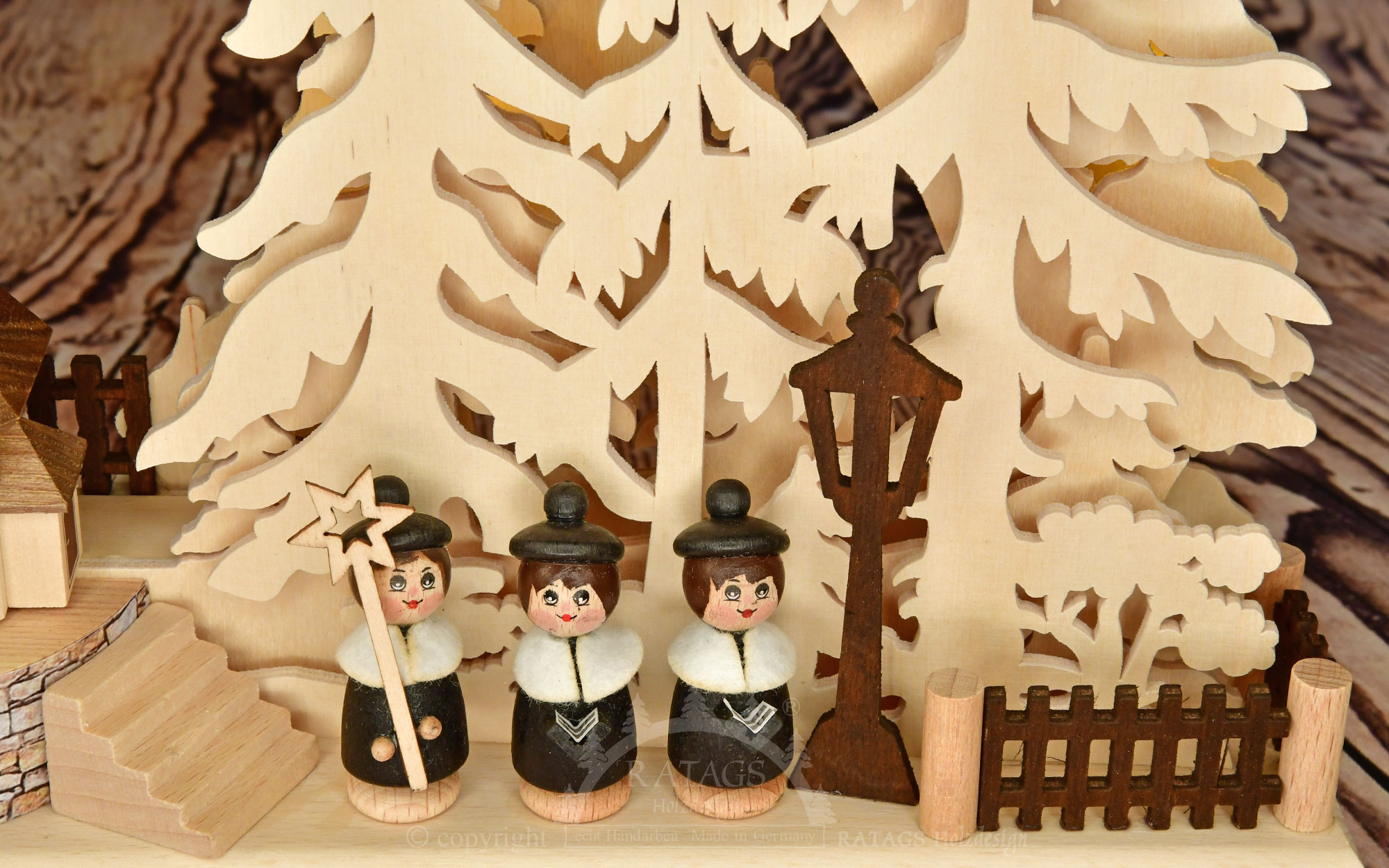 Dieser RATAGS-3D Schwibbogen mit indirekter Beleuchtung zeigt das beliebte Motiv der Seiffener Bergkirche. Im Vordergrund sind ein Häuschen und drei Kurrendesänger platziert. Alle Figuren und Gebäude sind aus Massivholz gefertigt und gebeizt oder von Hand bemalt. Ein echtes Liebhaberstück für Freunde erzgebirgischer Handwerkskunst.