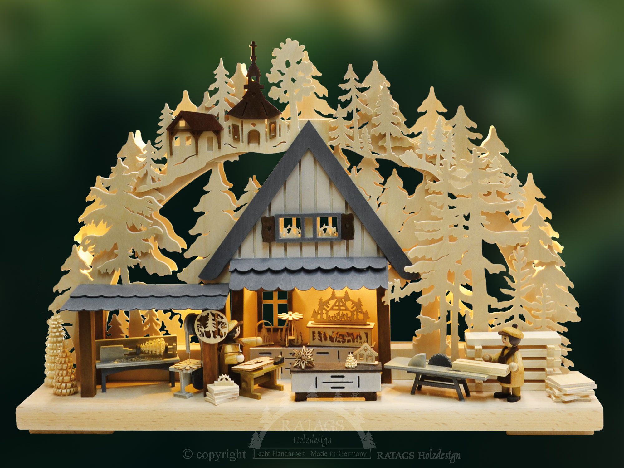 Vor einer Kunsthandwerkerstube mit Vordach arbeitet ein Handwerker an einer Kreissäge. Eine weiterer sägt mit einer Laubsäge einen Schwibbogen aus. Im Nebengelass befindet sich die Werkbank für das Spanbaumstechen. Gesäumt von einem filigranen Tannenwald ist dieser Schwibbogen mit RATAGS-Massivholzfiguren ausgestattet. Die typische Seiffener Kirche im Hintergrund verdeutlicht das Wesen des Erzgebirges.