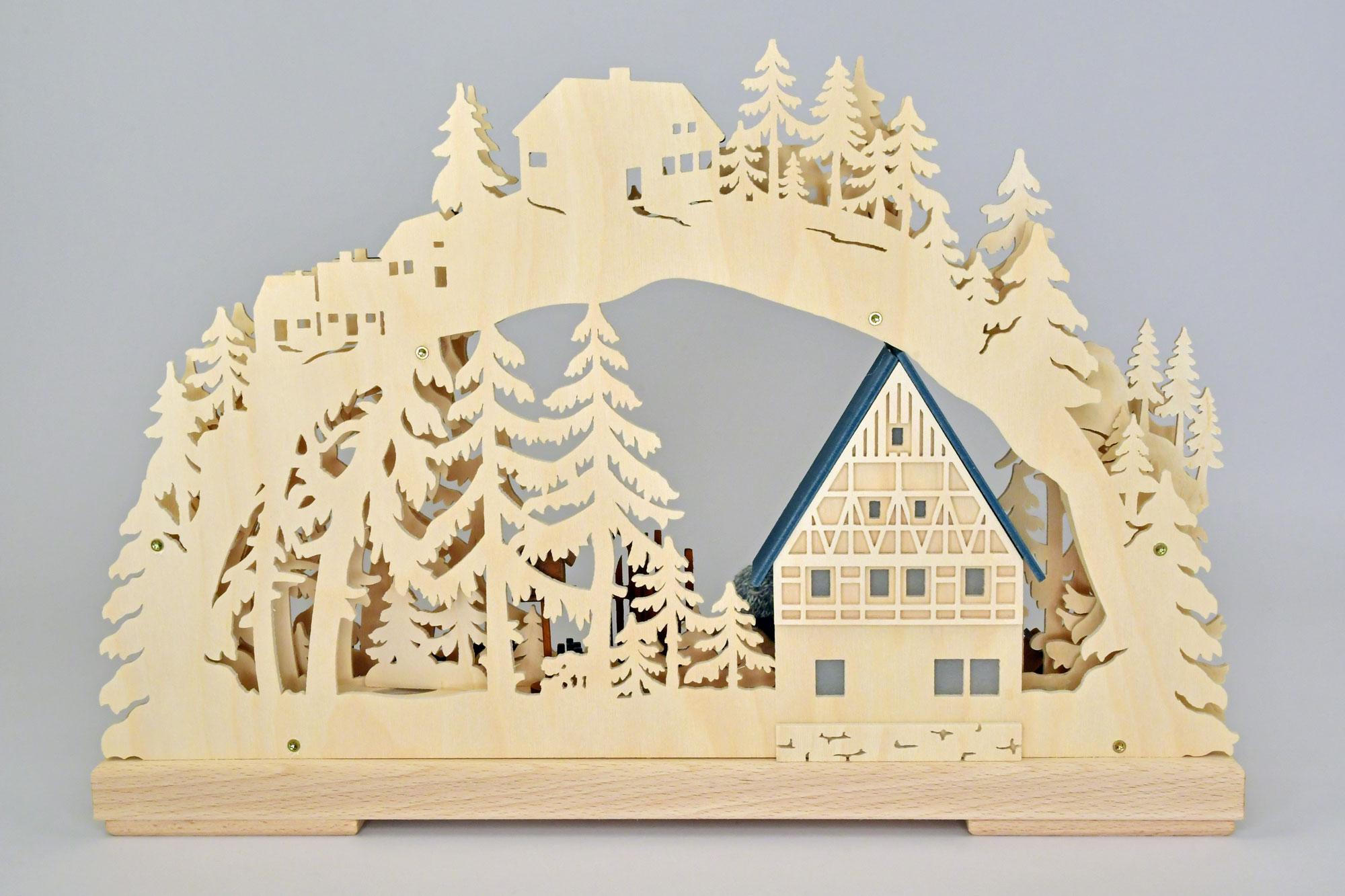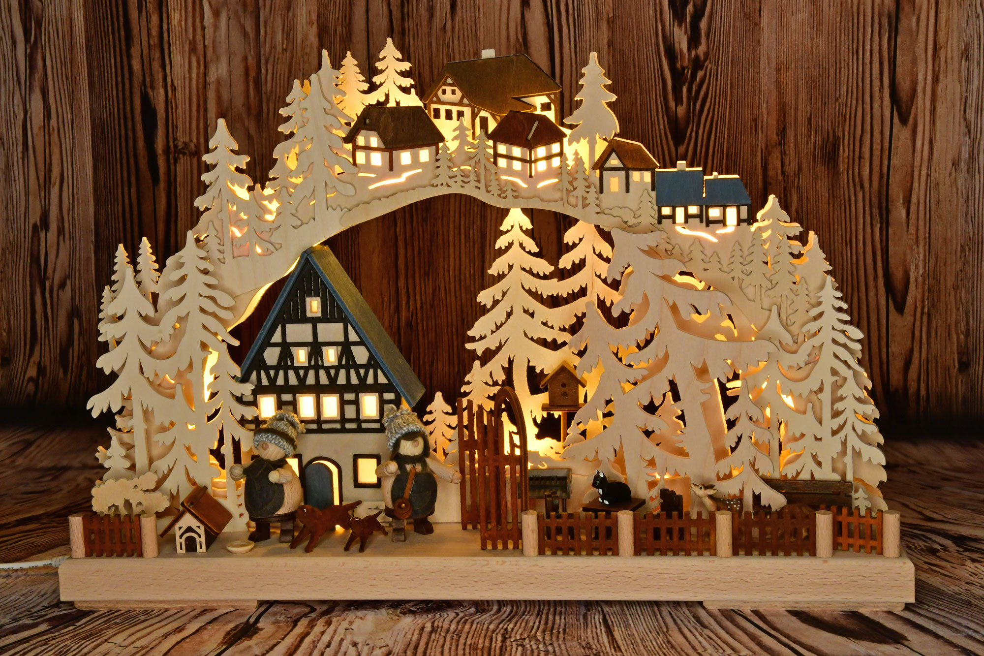 Dieser 3D-Schwibbogen wurde mit großer Liebe zum Detail gefertigt. Ein coloriertes Fachwerkhaus und pittoreske, kleinere Häuschen auf dem Außenbogen bilden einen schönen farbigen Kontrast zu den naturbelassenen Bäumen aus Birkensperrholz. Auch ein Vogelhaus und eine Hundehütte fehlen in diesem Lichterbogen nicht. 2 lustige Molli-Figuren beaufsichtigen 2 Hunde, eine schwarze Katze mit weißen Pfoten und 2 Rehe. Alle Figuren sind aus Massivholz gefertigt und farbig bemalt. Durch die blendfrei installierte LED-Lichterkette sind alle Fenster hell erleuchtet und tauchen den gesamten Lichterbogen in ein stimmungsvolles Licht.