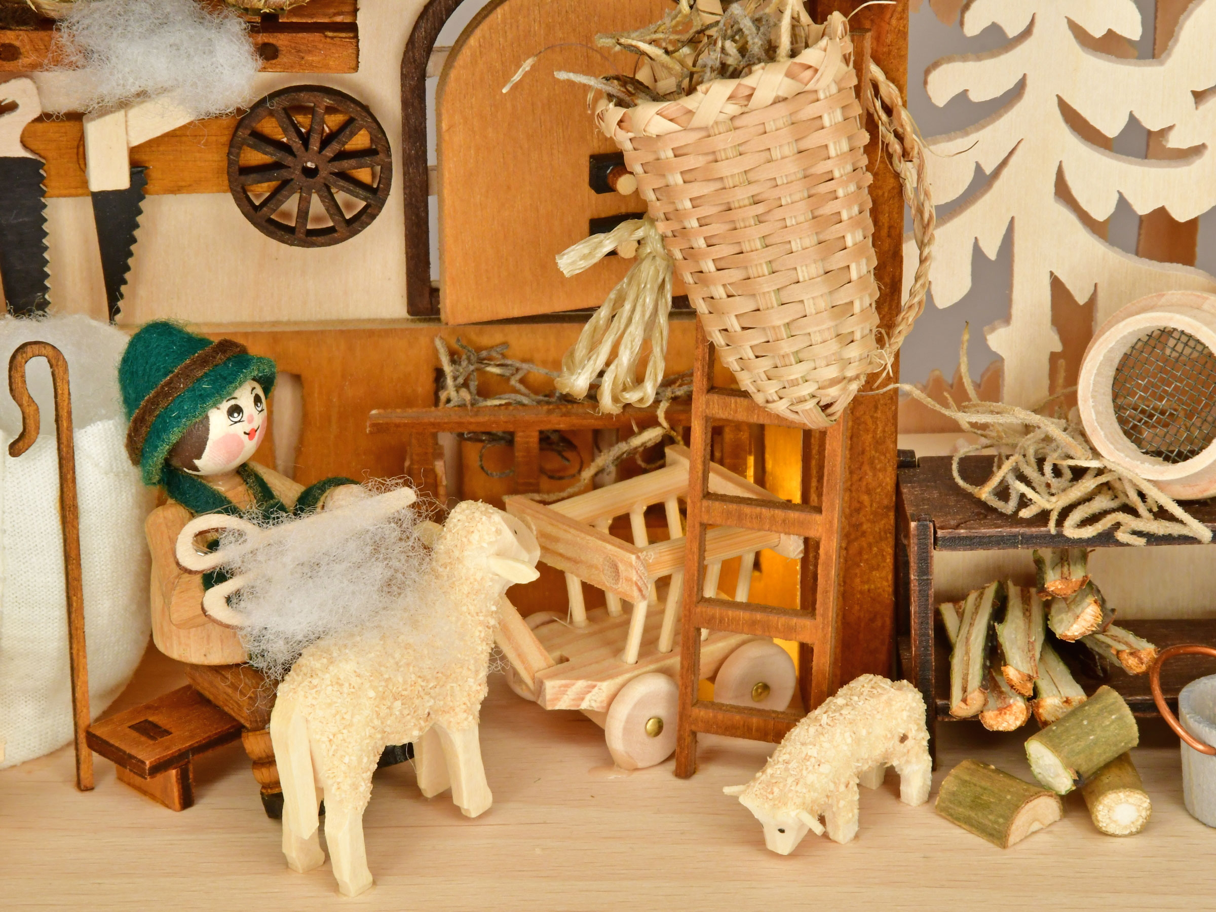 Einblick in die Arbeit einer Schäferei gibt dieser aufwändige 3D-Schwibbogen. Ein uriger schiefergedeckter Schafstall steht vor der Kulisse eines dichten Waldes. Der Schäfer ist mit der Schur eines Schafes beschäftigt, indes seine Frau die Fütterung der Tiere vorbereitet. Kleine Lämmer bleiben dicht bei Mama Schaf und das Hündchen sitzt am Kaninchenstall und hält Wacht. Von den umfangreichen Tätigkeiten in einer Schäferei zeugen die Arbeitsgeräte und Werkzeuge, die neben anderen nützlichen Dingen ordentlich bereitgestellt oder an der Wand aufgehangen sind. Körbe für Futter und Wolle sowie Eimer für Milch oder Käse werden ebenso benötigt wie die Sense zum Einbringen des Futters. Die blendfrei montierte LED-Lichterkette erzeugt eine plastische Beleuchtung und eine stimmungsvolle Raumatmosphäre. Dieser erzgebirgische Schwibbogen ist ein Schmuckstück und fesselt das Auge durch reizvolle Details.