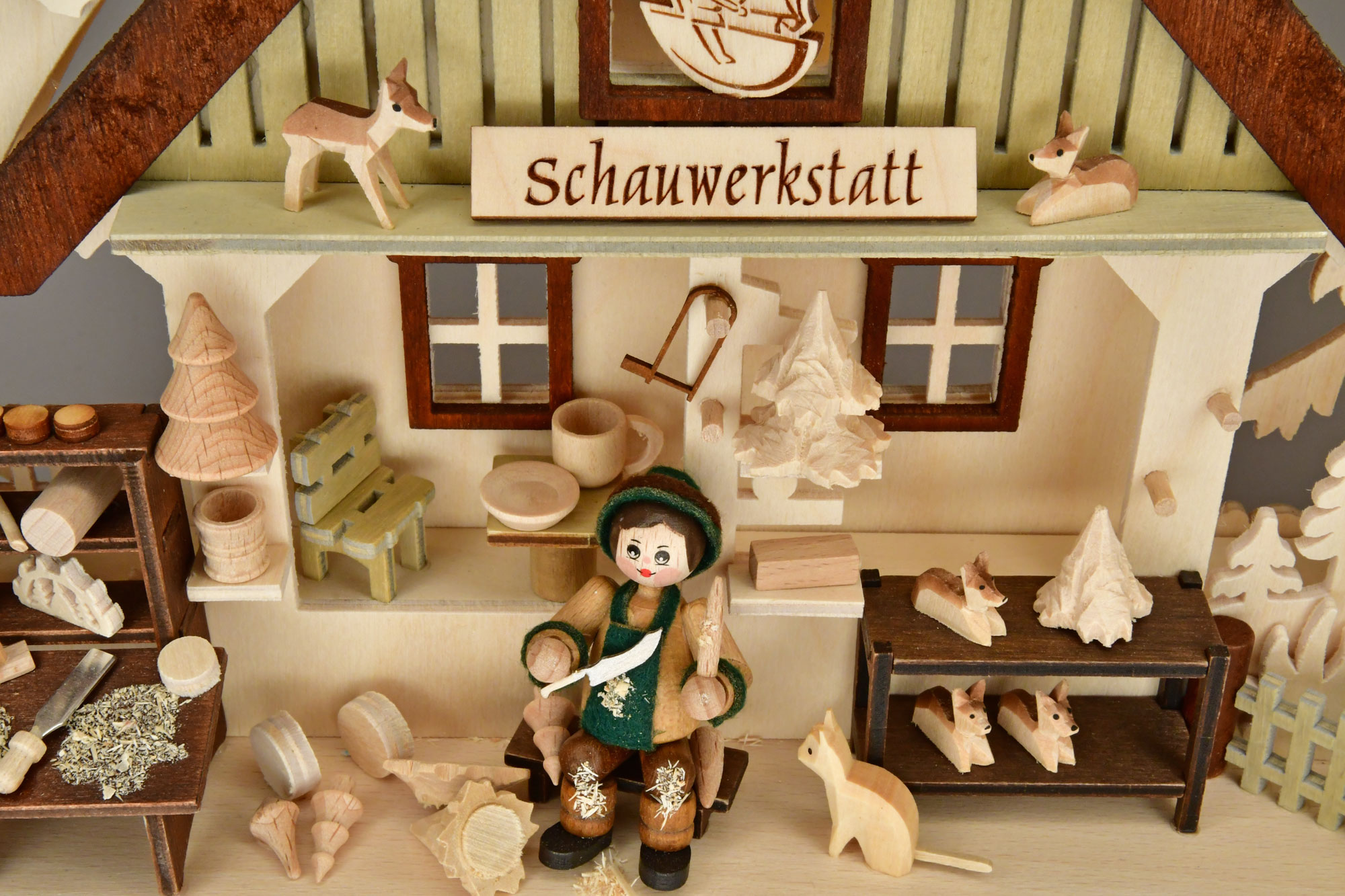 Nicht fehlen darf im Erzgebirge das Schnitzhandwerk. In diesem 3D Schwibbogen können Sie dem Schnitzer über die Schulter schauen und die Herstellung von handgeschnitzten Rehen und Bäumchen beobachten.