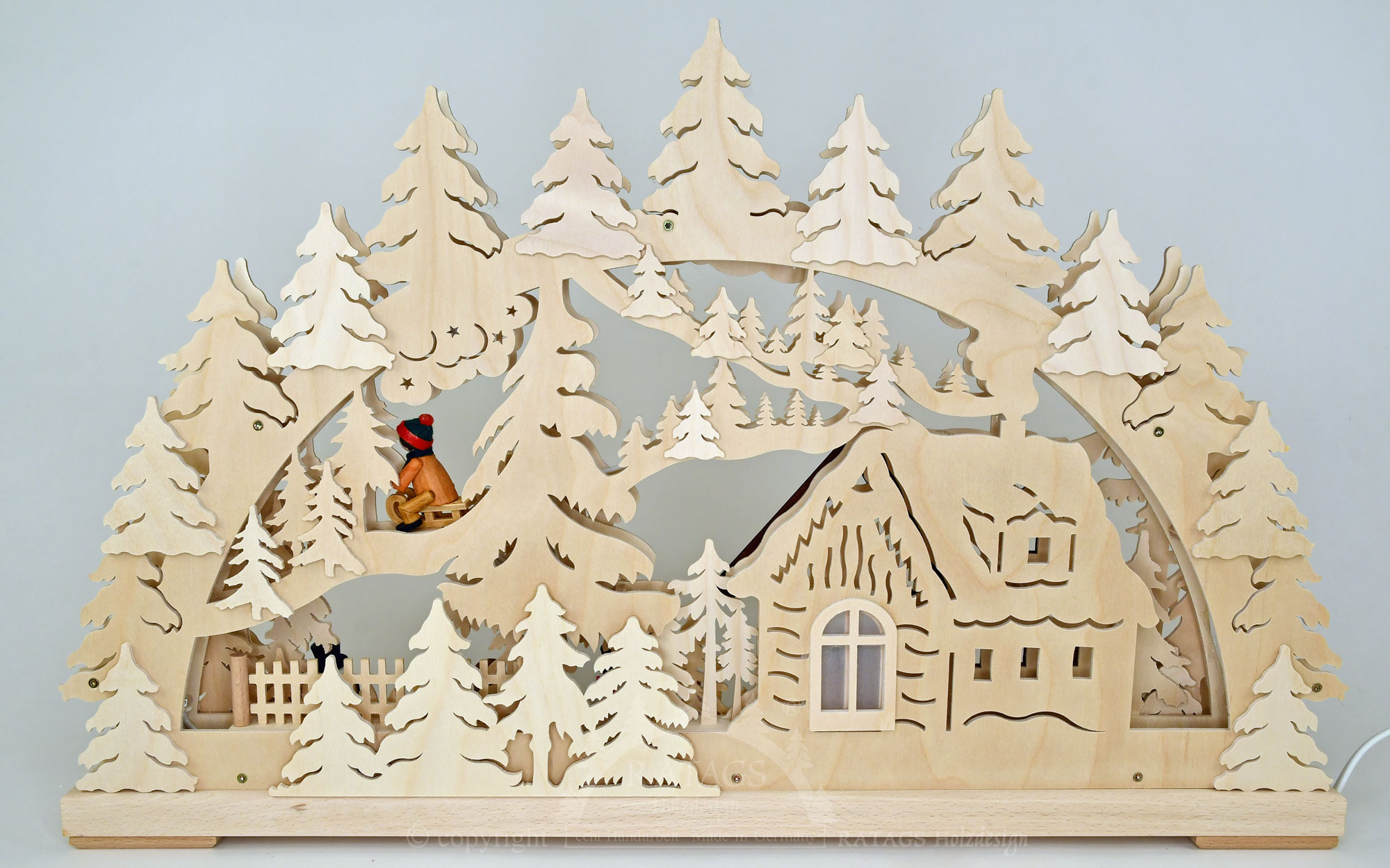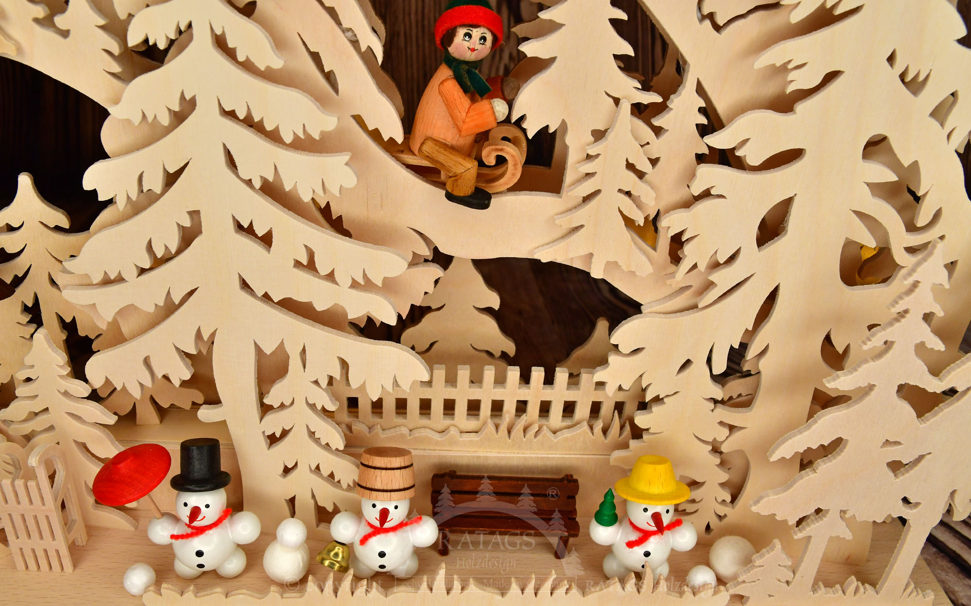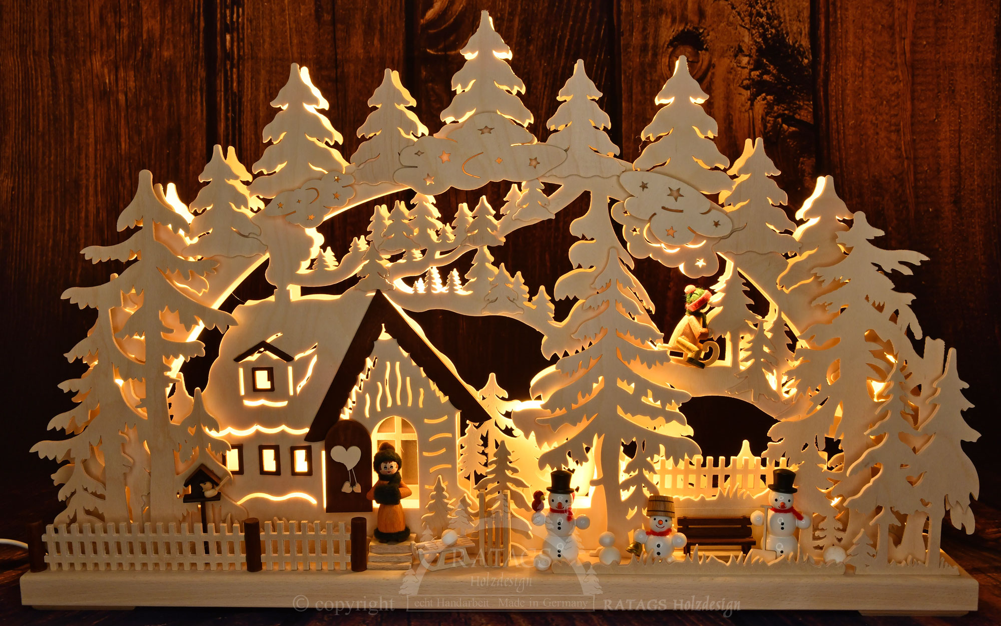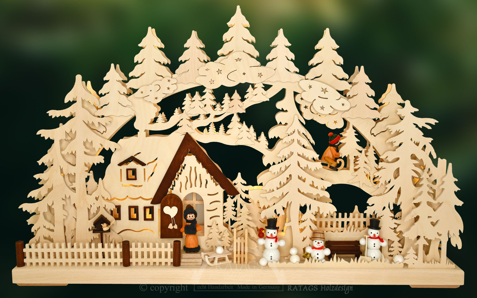 Die Kartoffeln sind fertig. Mutter schaut nach Ihren Kleinen. Da, das Erste saust schon die Bahn runter. Helles Kinderlachen hallt durch das tief verschneite Tal. Im Garten steht eine lustig drein schauende Schneemannfamilie, freut sich über den kindlichen Winterspass. Hier im romantisch dichten Winterwald werden Träume wahr. Der hier vorgestellte 3D-Lichterbogen wird indirekt mit LED beleuchtet. Sie erhalten diese schöne erzgebirgische Handarbeit in edlen Naturholz.