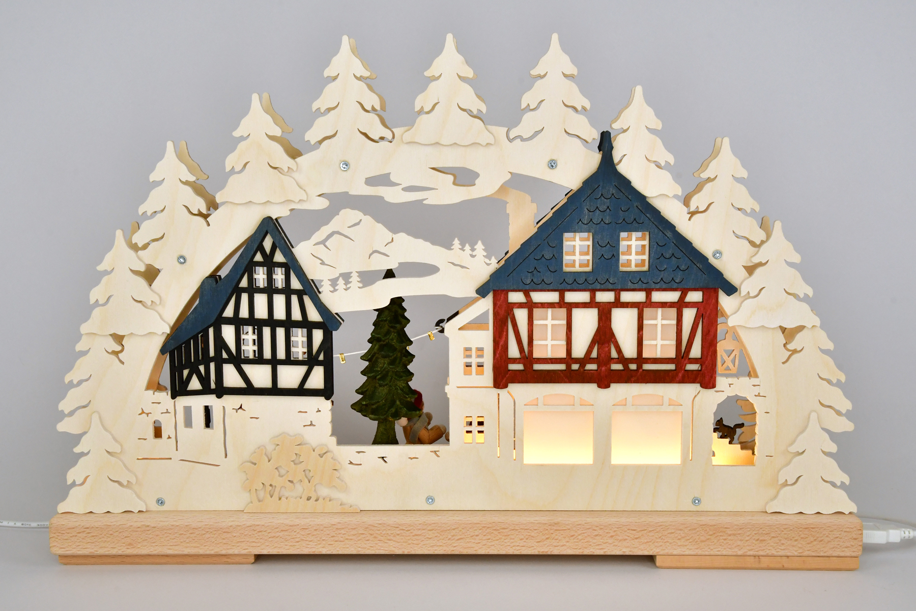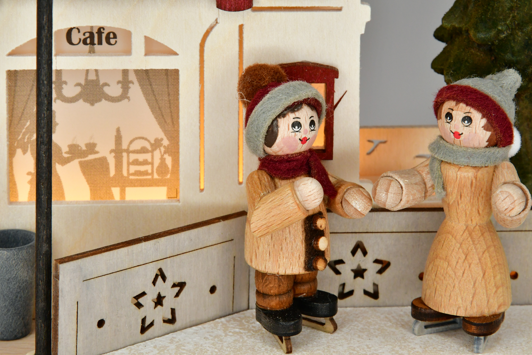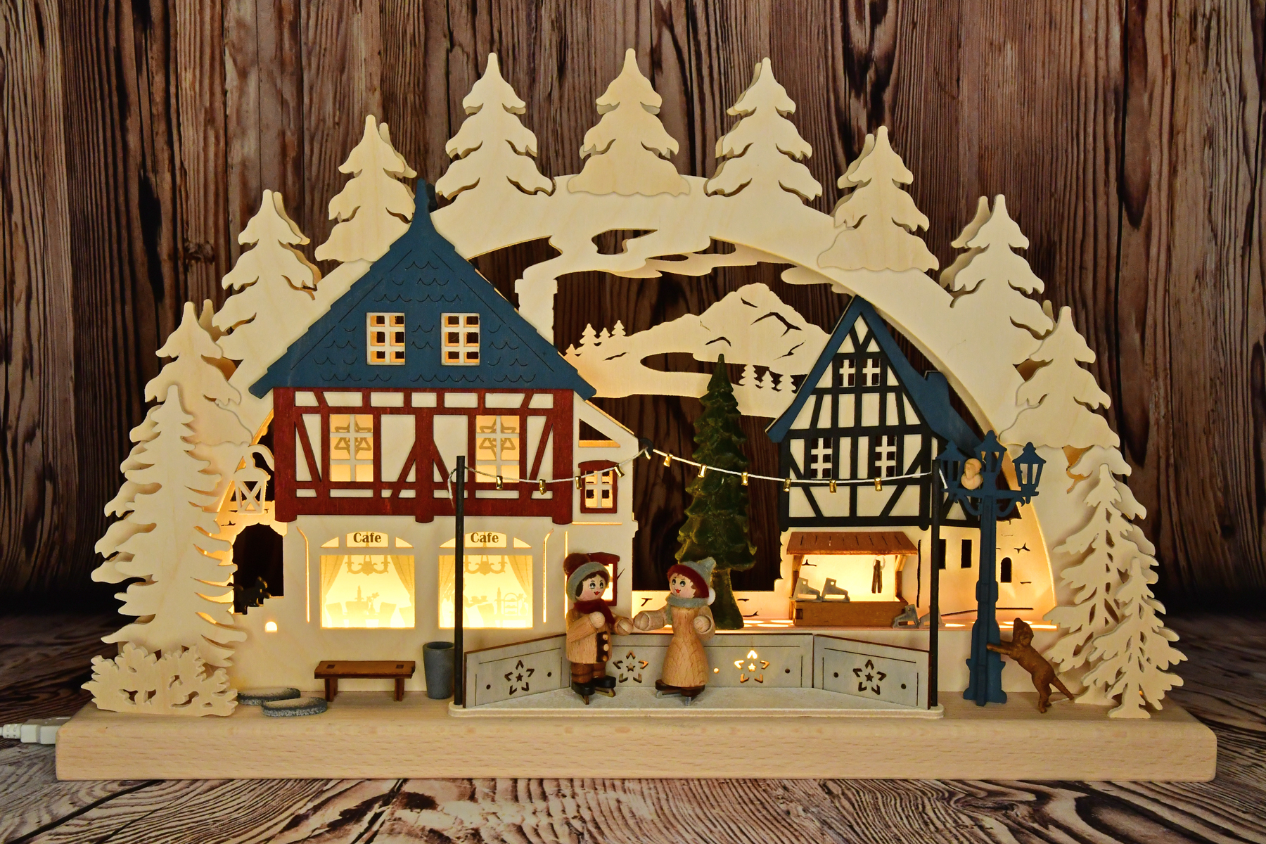 Auf einem stimmungsvollen Marktplatz zur Winterszeit ist vor der Kulisse historischer Fachwerkhäuser eine Eisbahn aufgebaut. Unter einer Lichterkette läuft ein Pärchen Schlittschuh. Ein gemütlich beleuchtetes Café lädt zum Aufwärmen ein, während ein Hündchen an der Laterne ein Vögelchen verbellt. Die Figuren, das Hündchen und die Tanne sind aus Massivholz gefertigt und farbig lasiert. Eine blendfrei montierte LED-Beleuchtung und erleuchtete Fenster verleihen diesem Schwibbogen ein festliches Gepräge.