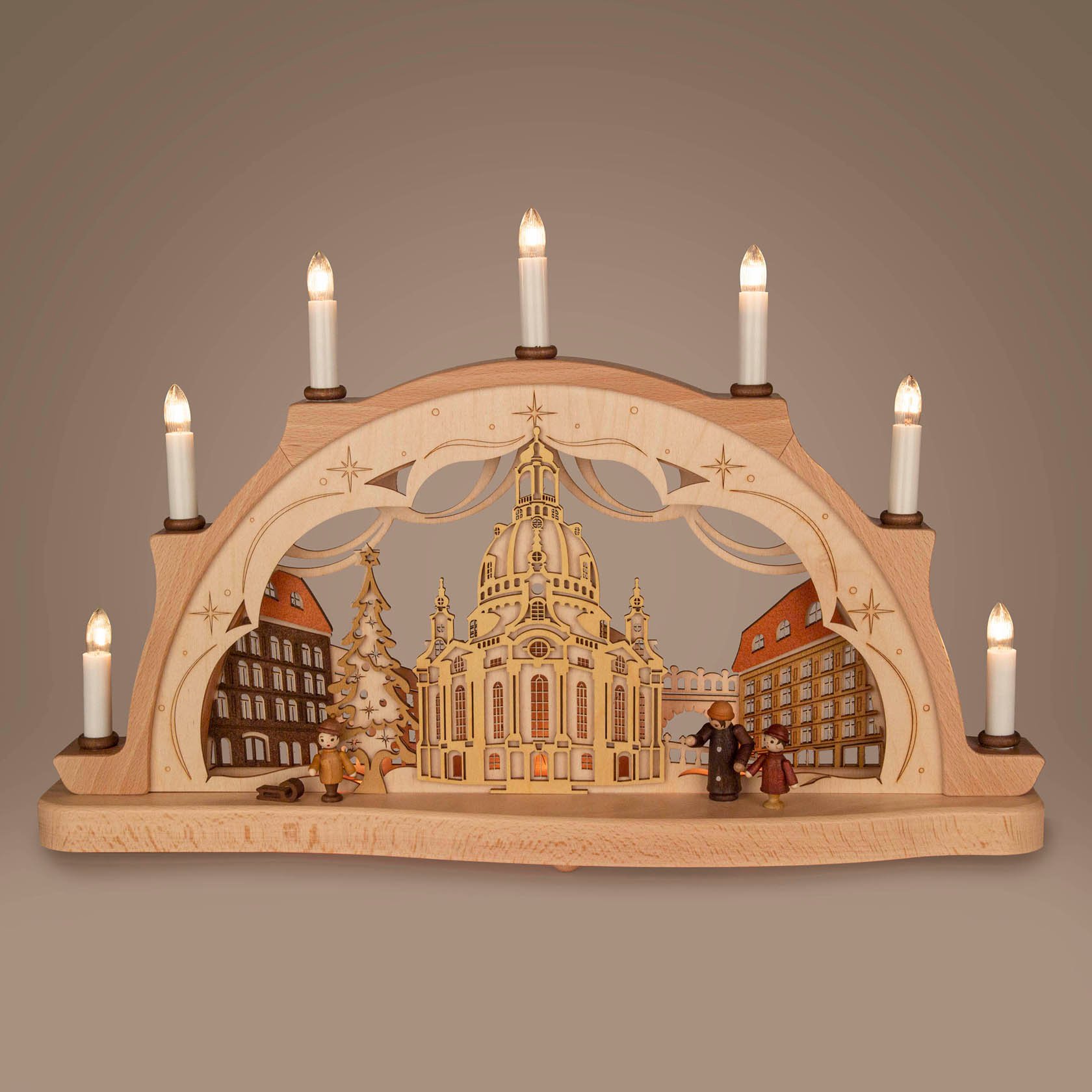 Das Fachgeschäft Volkskunst aus Seiffen präsentiert den Artikel Schwibbogen Dresdner Frauenkirche in 3D Optik mit elektr. Beleuchtung 33x52cm der Marke Dregeno
