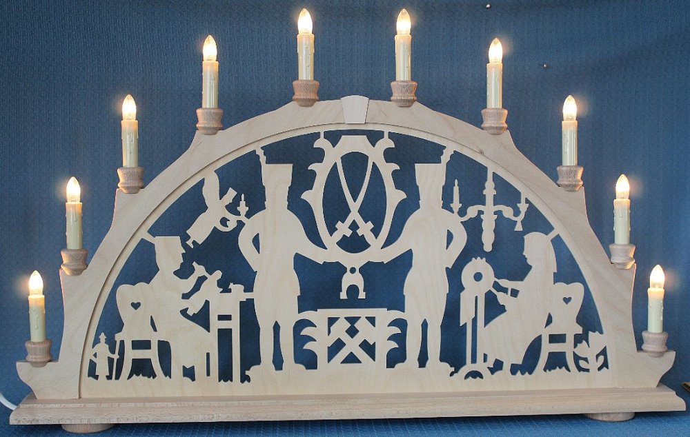 Mit 2 Bergleuten, dem Schnitzer und der Klöpplerin ist dieser typische erzgebirgische Schwibbogen gefertigt. Seine Beleuchtung sind 7 Kerzen und die Länge ist ca. 60 cm.