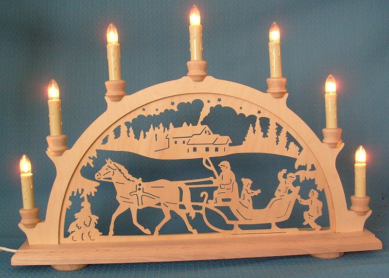 Dieser Schwibbogen ist eine traditionell erzgebirgische Laubsägearbeit. Im tief verschneiten Winterwald macht eine Schlittenfahrt viel Freude. Weit erklinge der Klang der Schlittenglocken. Ach! Hier hat doch jemand den Schlitten verpasst und springt noch schnell zur Fahrt auf. Bestückt ist er mit 7 Kerzen ( 34 Volt, 3 Watt ), die als Ersatzkerzen auch hier im Shop erhältlich sind. Die Länge des Bogens beträgt ca. 49 cm.