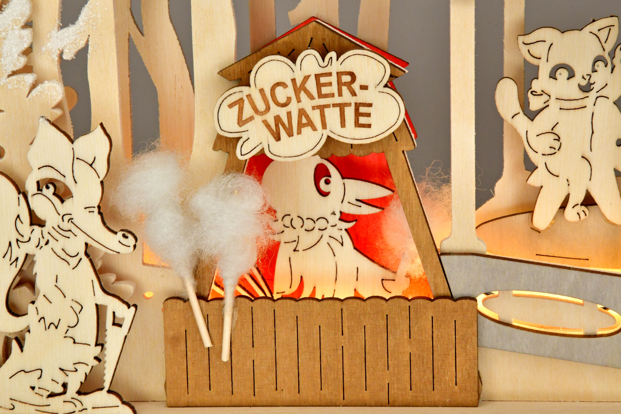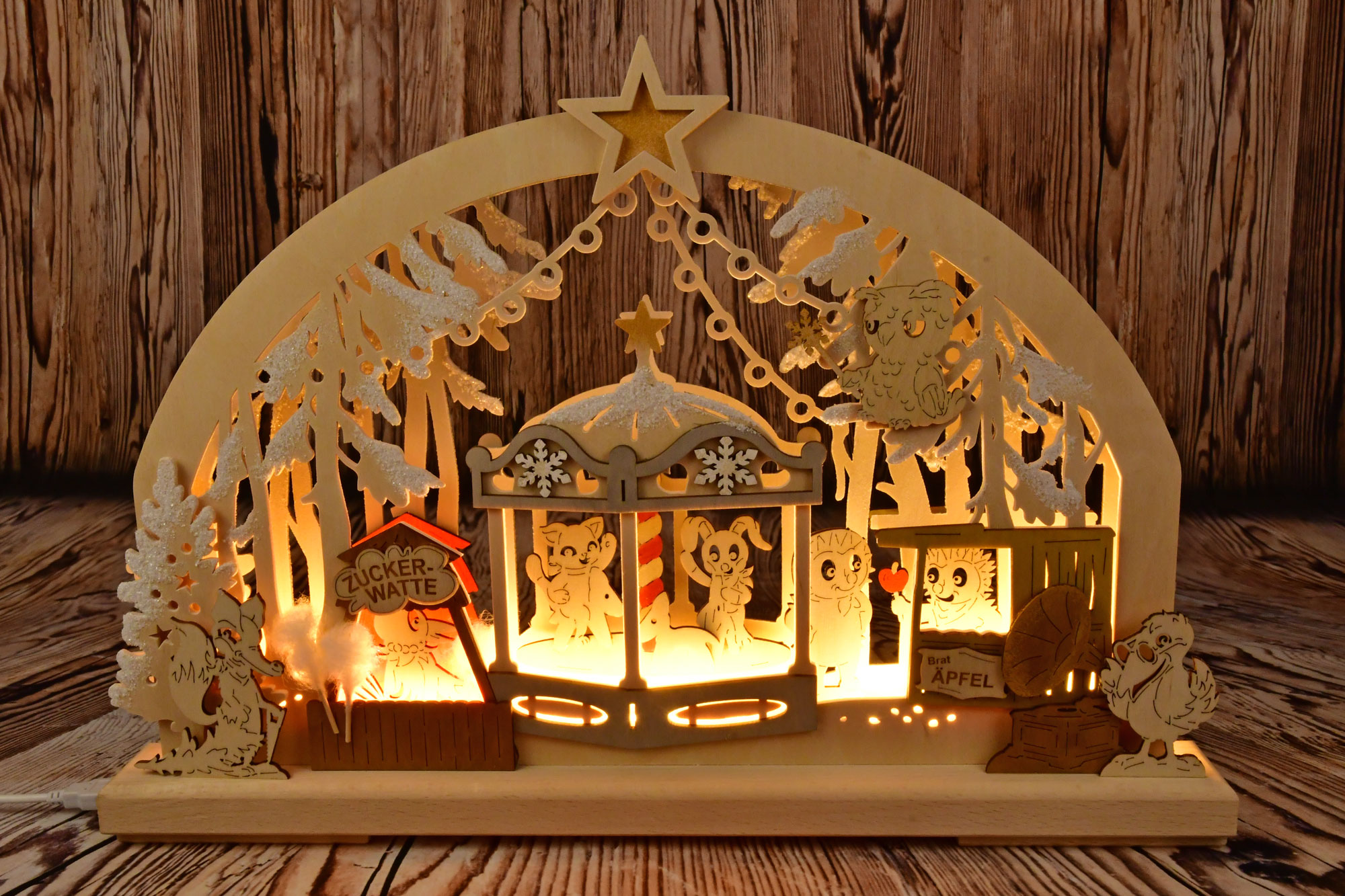 Produktinformationen "Schwibbogen kl., Weihnachtsmarkt, Märchenwald, farbig, Raureif, LED-Stripe"