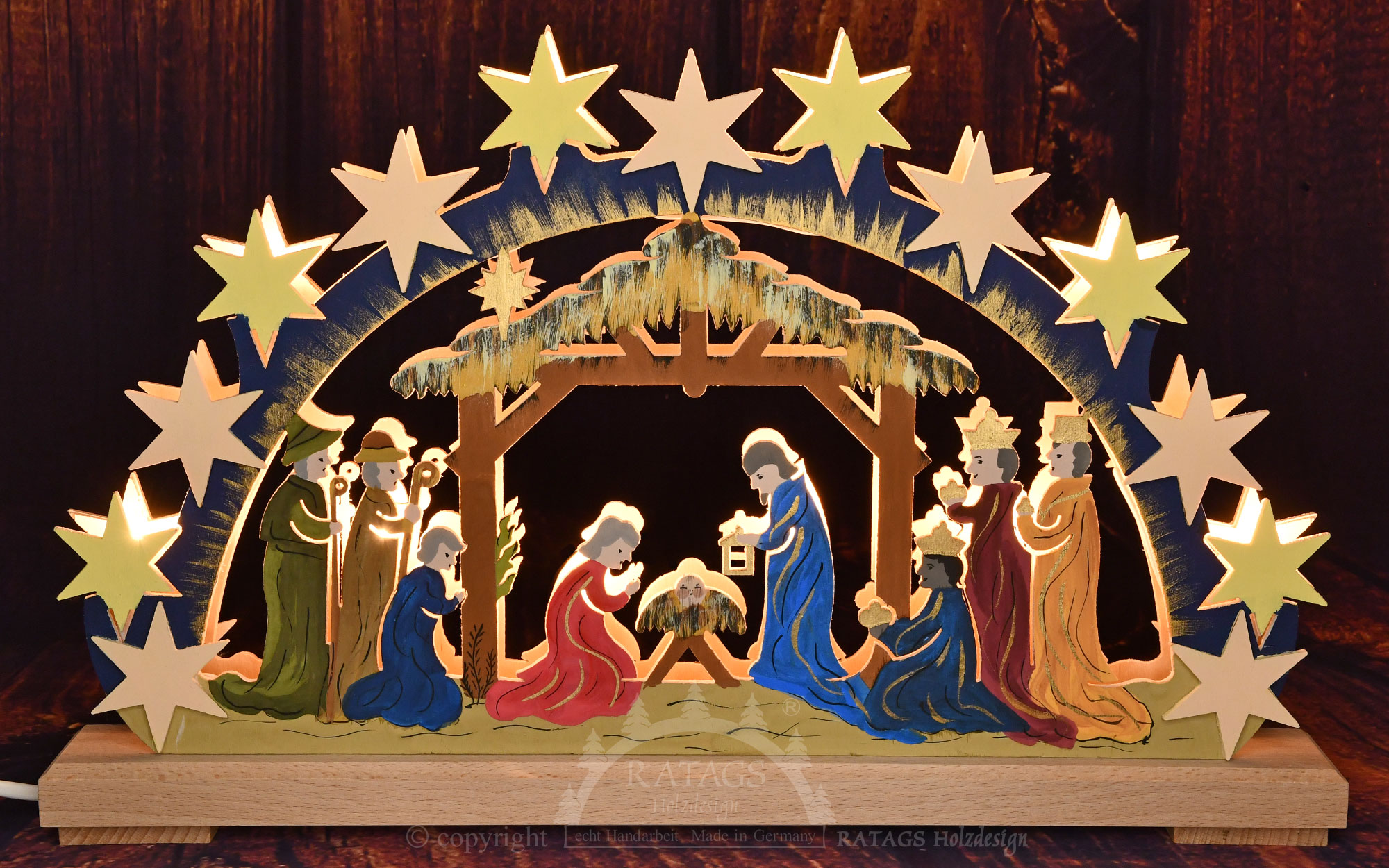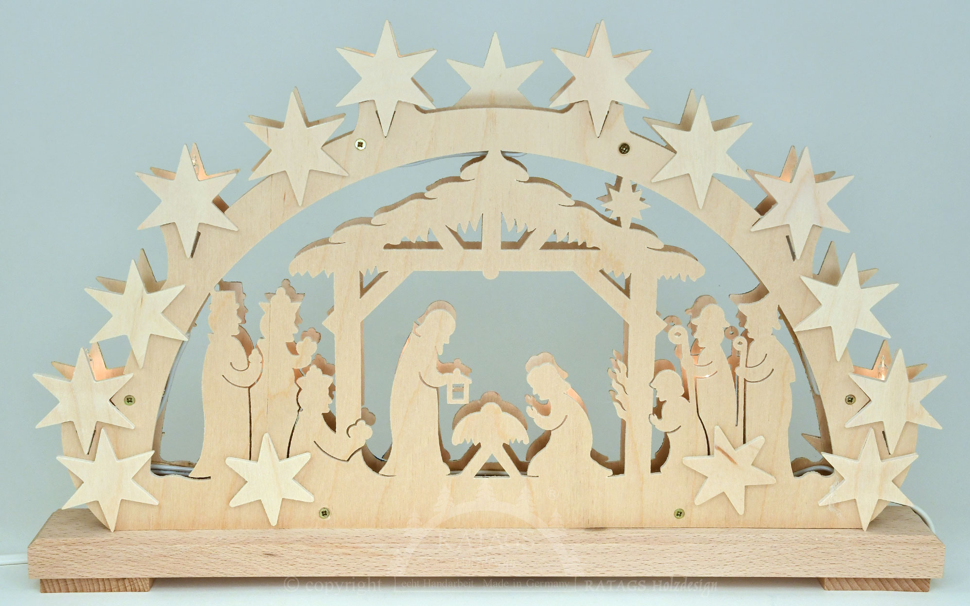 Liebevoll gestalteter kleiner Schwibbbogen mit der Darstellung von Christi Geburt im Stall von Bethlehem. Goldene Strahlen rahmen die Geburtsszene mit der Krippe und dem Christkind ein. Die indirekte, blendfreie Beleuchtung sorgt für eine stimmungsvolle Raumatmosphäre.