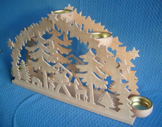 Dieser Waldschwibbogen ist doppelt gefertigt und für 5 Teelichter bestimmt. Er wirkt seht dekorativ als Tischleuchter oder auf Schränken. Größe: 40x6x22 cm